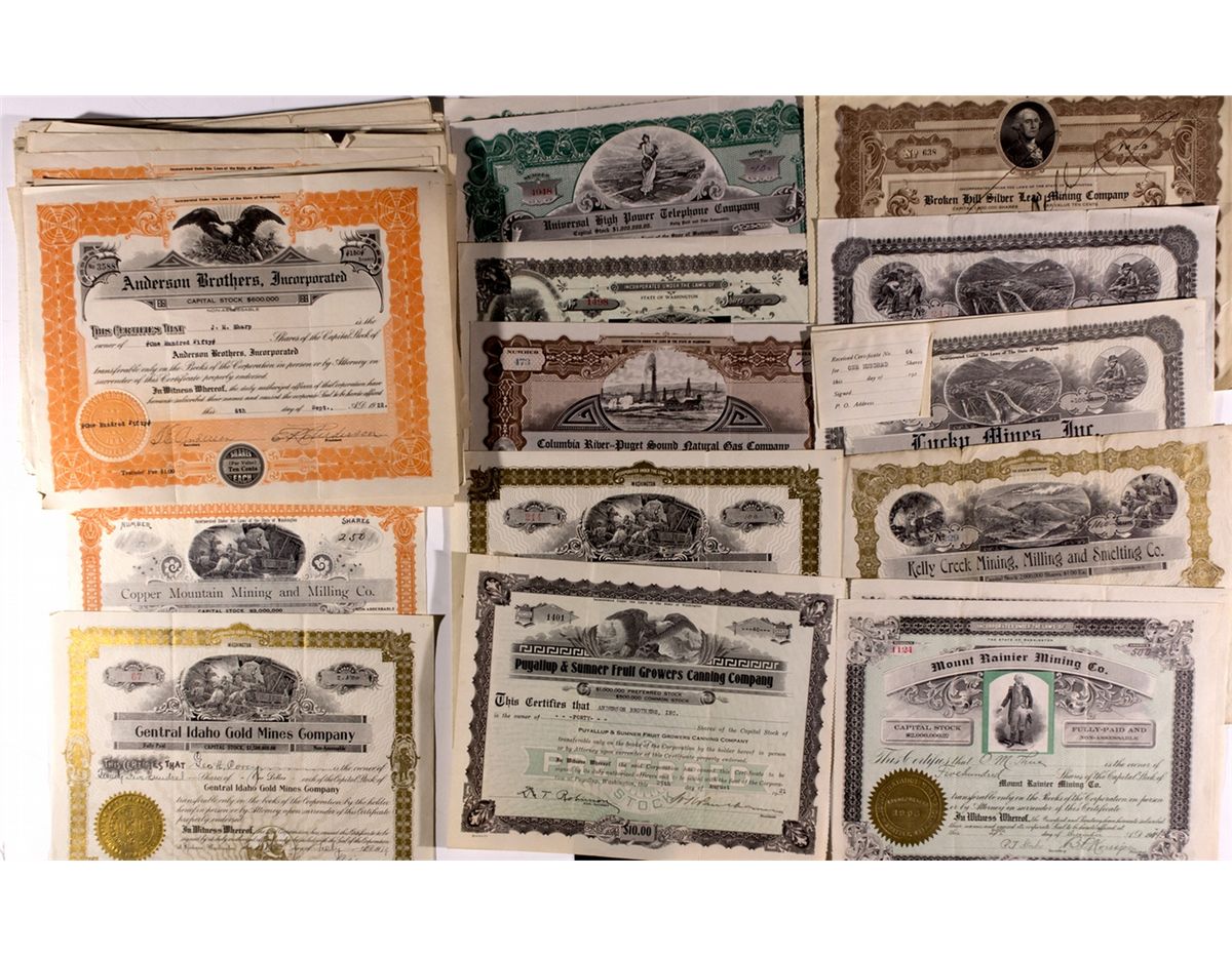 Some pictorial pieces included. Most are from Anderson Brothers Incorporated of Vancouver, Washington. Other companies represented include The Columbia Dairy Products Company, Western Coal and Iron Company and Lucky Mines Incorporated. Conditions of the certs vary, but most are in very good condition. -60465