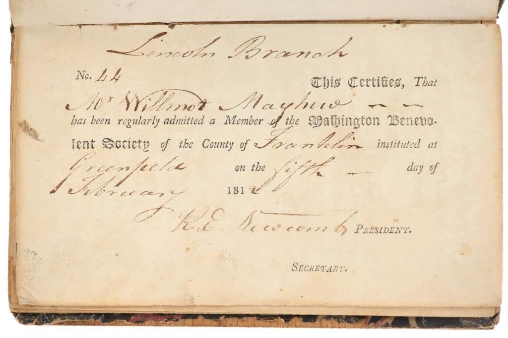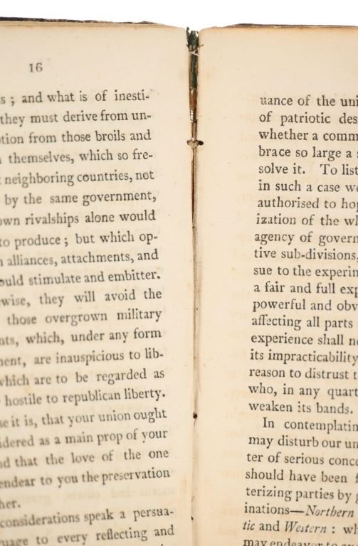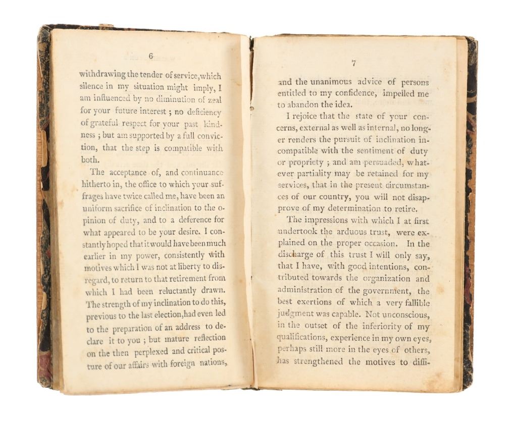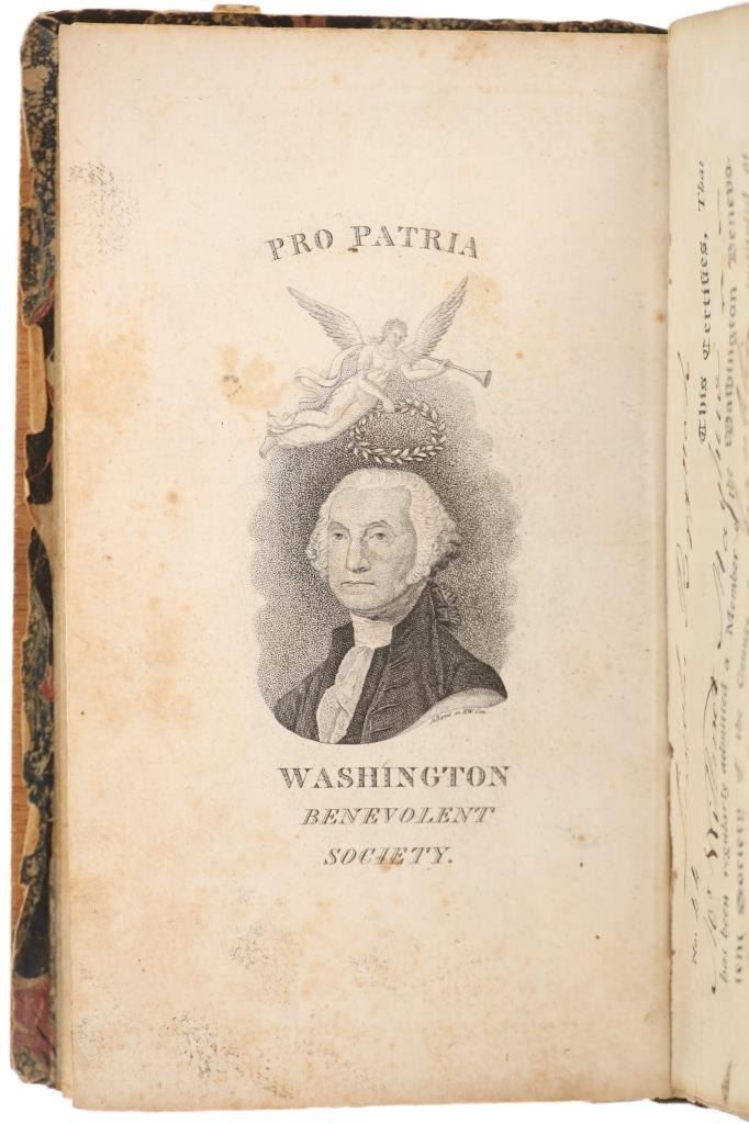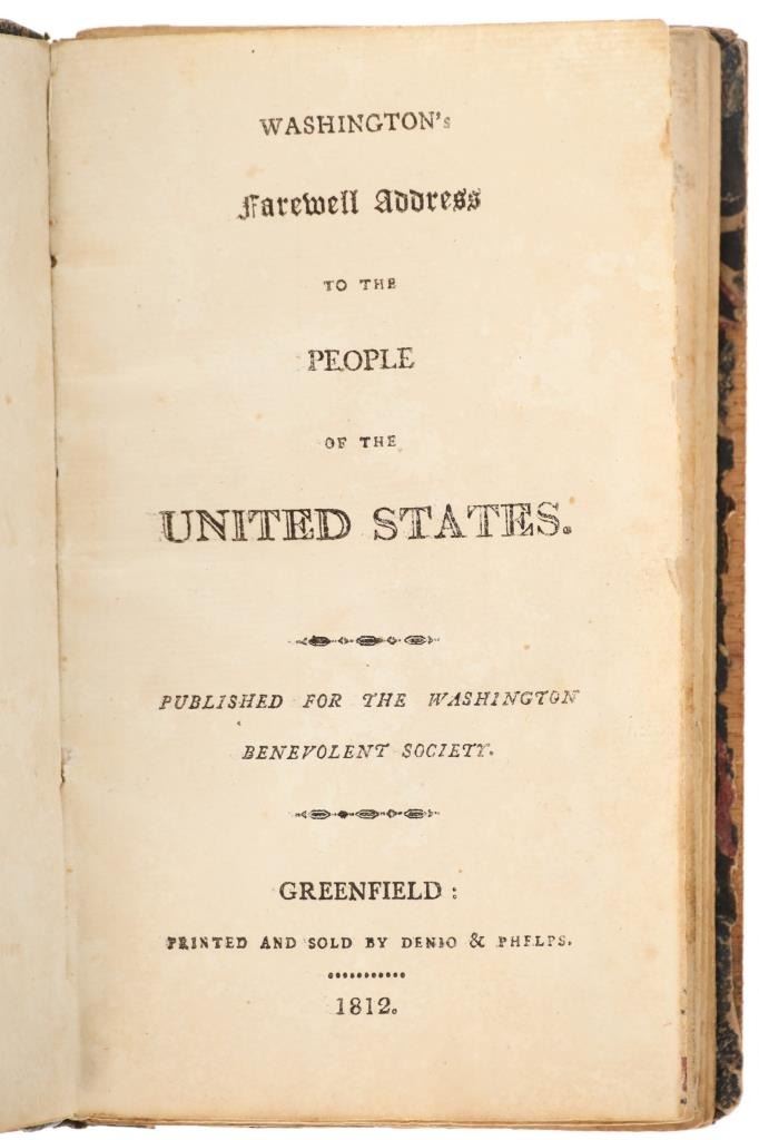 Featured in this lot is "Washington's Farewell Address to the People of the United States" published for the Washington Benevolent Society, printed and sold by Denio & Phelps circa 1812. At the conclusion of his second term as President, in September 1796, Washington delivered the well-known Farewell Address, which was primarily written by Alexander Hamilton. It highlighted the value of morality and unity, cautioned against the perils of political factions and sectionalism, and warned against the "insidious wiles of foreign influence." The speech sparked an instantaneous and enormously enthusiastic response, which was documented in local newspapers as well as in distinct booklets and broadsides sent across the country. Copies of Washington's address were distributed to members of the grassroots political organizations known as the Washington Benevolent Societies, which were founded by the Federalist Party between 1808 and 1816. The portrait frontispiece's engraver, Thomas Gimbrede, was a miniature painter and engraver who was born in France in 1781. In 1802, he left France to immigrate to the US. He started out making miniatures, but by 1810 he was working for New York City publishers like John Low. At the United States Military Academy at West Point, he was named instructor of drawing in 1819 and remained there until his death in 1832. Below the frontispiece engraving shows the certification page reading, "Lincoln Branch / No. 44 This certifies, That H. Willmot Mayhew has been regularly admitted a Member of the Washington Benevolent Society of the County of Franklin, instituted at ? on the fifth day of February 1812 / K.E. Newcomb, President. / Secretary". Around the engraving it reads, "Pro Patria / Washington Benevolent Society". The front cover shows a marbled design with colors of brown and beige, while the spine shows a green color and gold gilt lettering reading, "Washington". The book shows good condition overall despite its antique age. It shows wear from its age and use over the years but no signs of major damage is present. Foxing and staining is noted throughout the interior pages, but still in good, readable condition. The book measures 6 5/16" L x 3 7/8" W x 1/4" D.