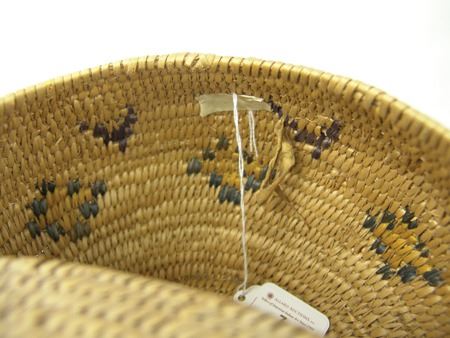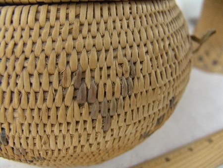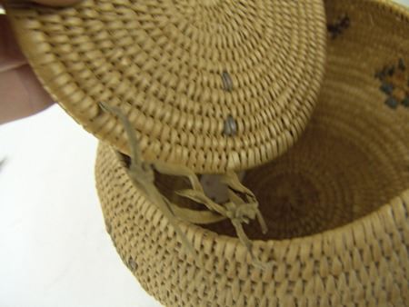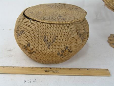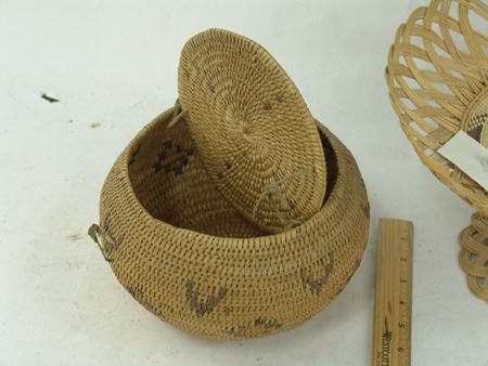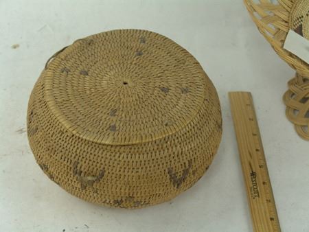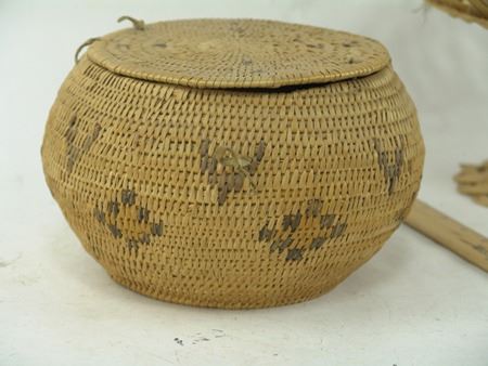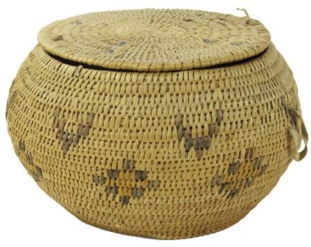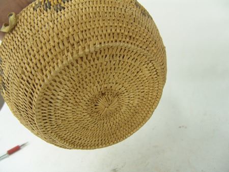 Late 1900s, Unique old single rod bowl with flat lid, chevron symbols, and polychrome diamond figures. Good condition. 5-1/2" x 9"