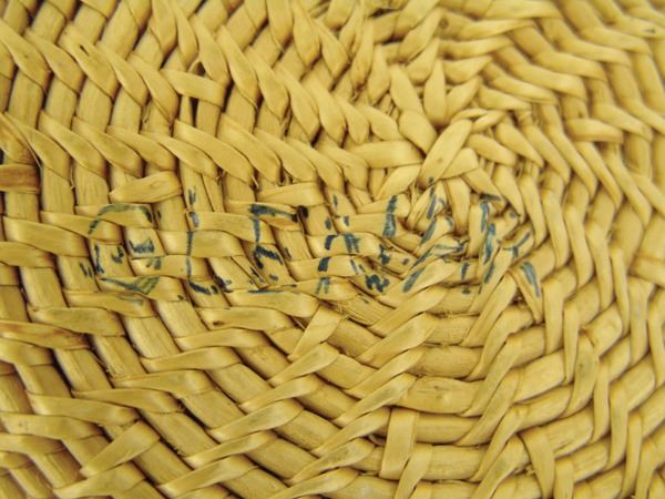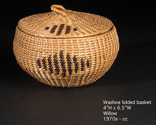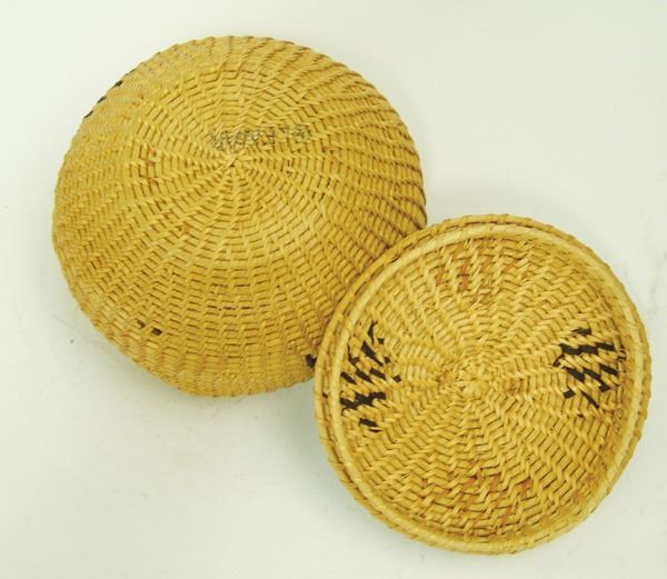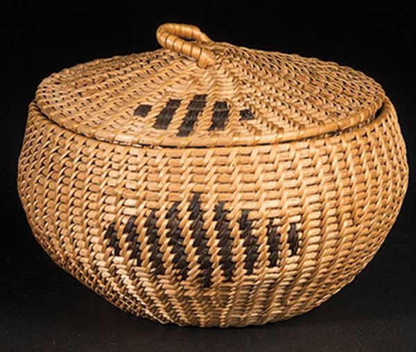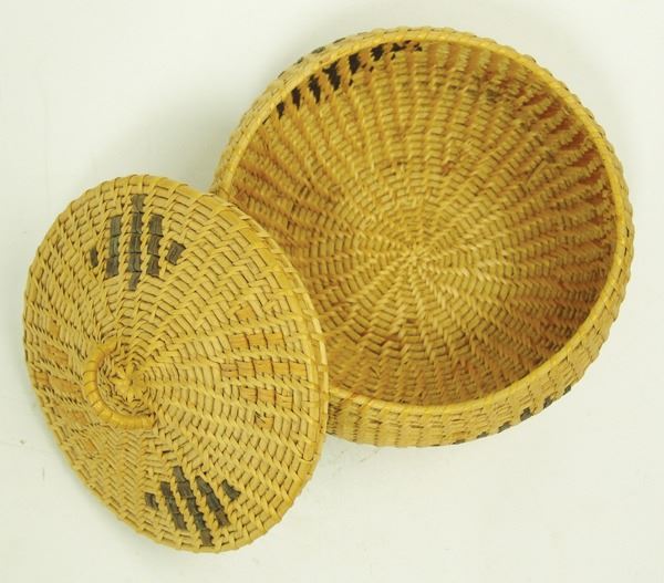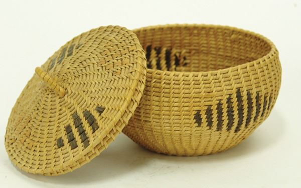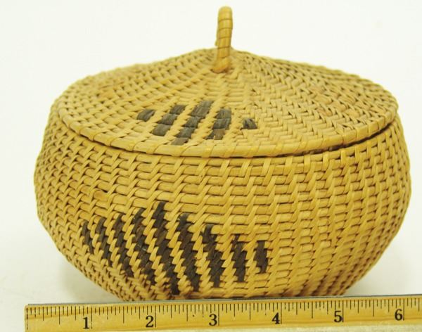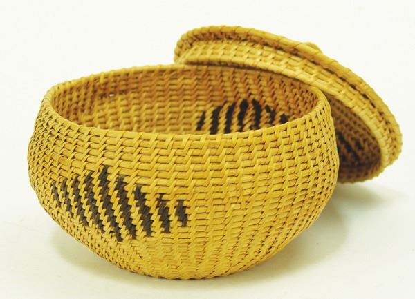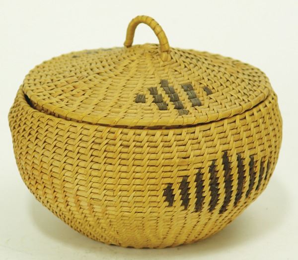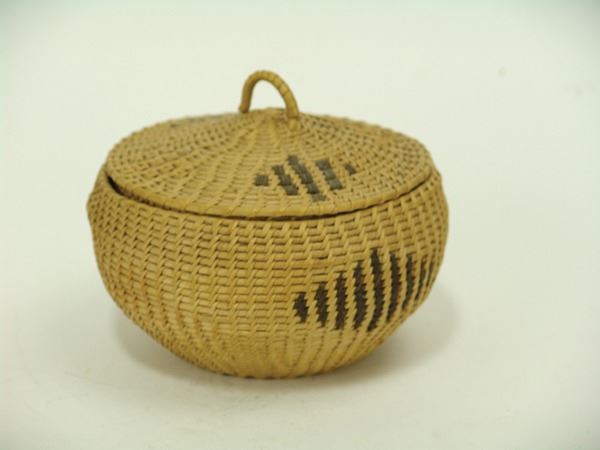 Classic, lidded, single-rod treasure basket with simple geometric symbols done in black and gold, in spaced-stitch style. Very good condition.Early/Mid 1900s4-1/2" x 6-1/2"