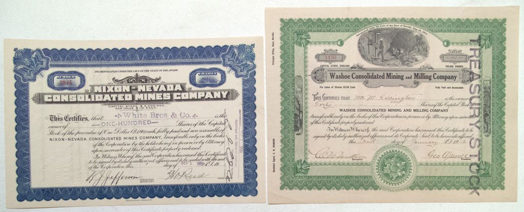 Lot of 2. First is a Washoe Consolidated Mining and Milling Company. 10 ¾” x 8 ½”. Stock number 1156 for 40 shares issued to Mr. M Harrington on January 3, 1912. Signed by Secretary C.N. Miller and President George Oswell. Vignette of a miners at work in the top center. Green border and black print. Embossed seal on the bottom center. Two creases present down the stock from being folded in the past. Stamp mark in the right side reads “Treasury Stock.” U/C. Second stock is the Nixon-Nevada Consolidated Mines Company. Measures 11”x 7”. Stock number 3945 for 100 shares. Issued to White Bros. & Co. on September 1, 1928. Signed by Treasurer Secretary R. J Jefferson and president W.O. Reed. Blue border and black print. Embossed seal on the lower left corner. Creases present down the stock from being folded in the past. U/C.