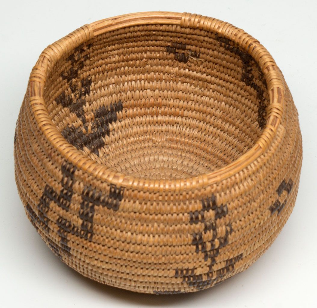 c1915-1950 - A lovely small example of fine Washoe basketry. This coiled basket is made of willow with bracken fern root used in the flower and zigzag design (which may represent a river). It measures 2.5” in height, has a 2.5” base diameter, and is 3” diameter at the mouth. The weaving is very fine. Some stitches are missing around the rim; otherwise, this basket is in excellent condition. We estimate that it was made in the early years of the last century.