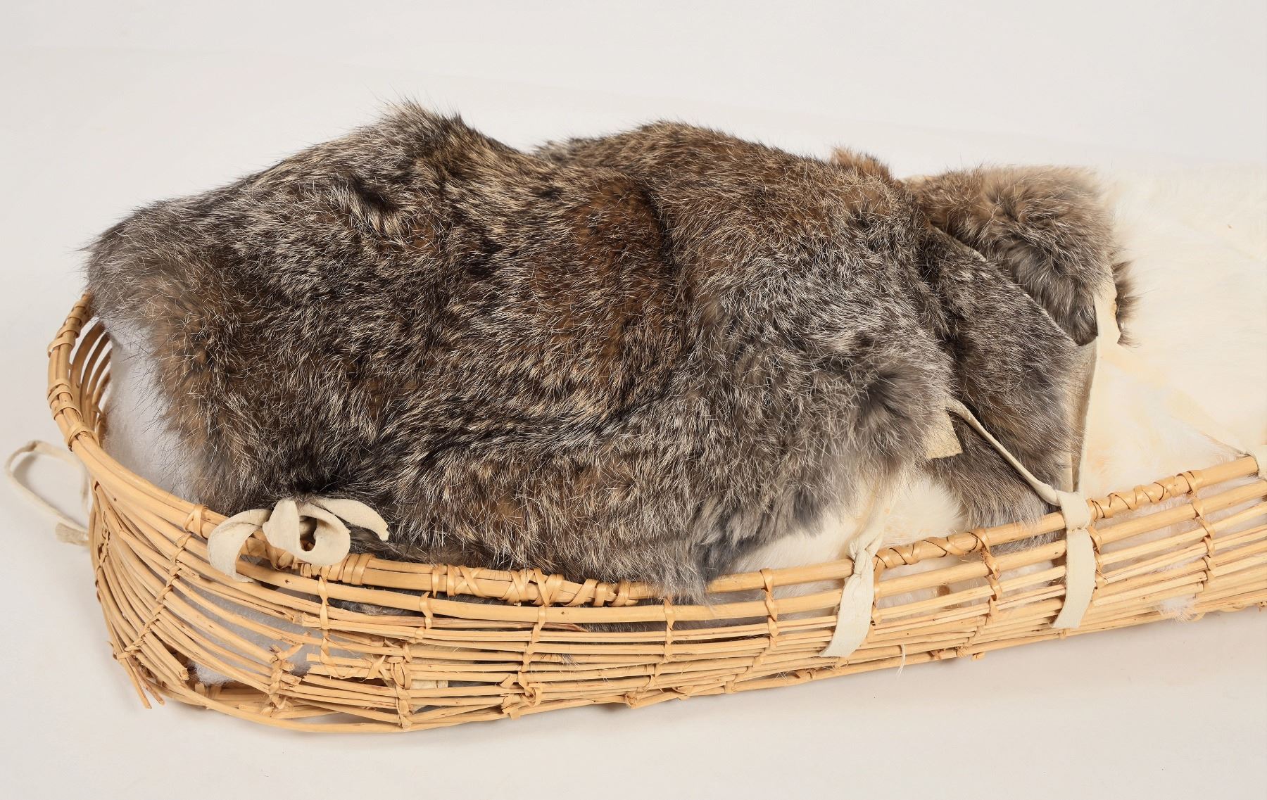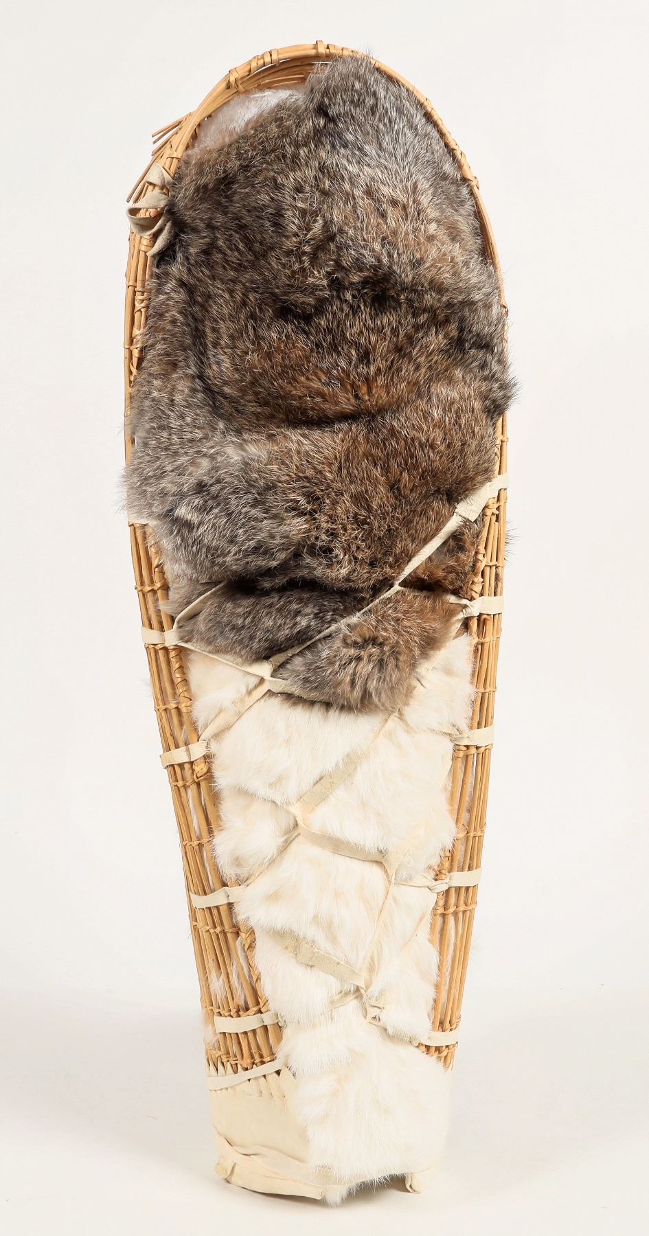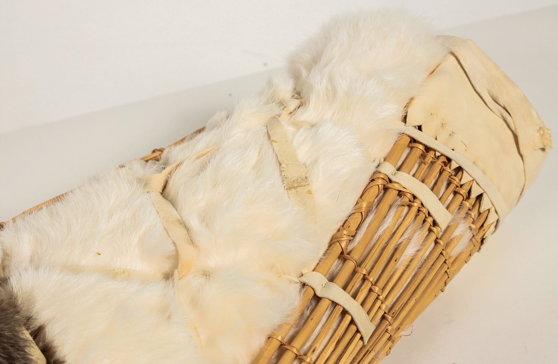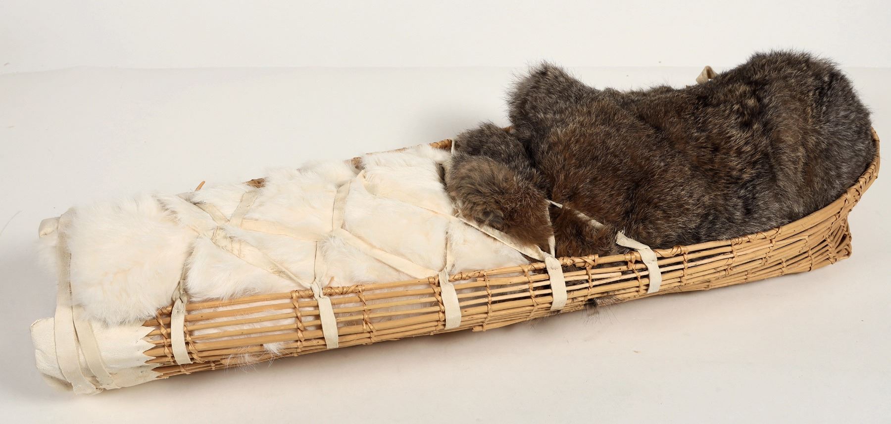 This is a Washoe receiving basket type cradleboard. These were used as a temporary cradle until the gender of the child was known. Willow rod construction and lined with rabbit skins at 27 in. in length. Please see photos for details.