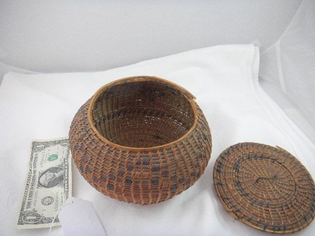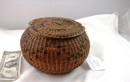 Washoe Single Rod Gap Stitch Basket with lid from 1890's. Poor condition measures 6 x 7 inches Shipping $18.00