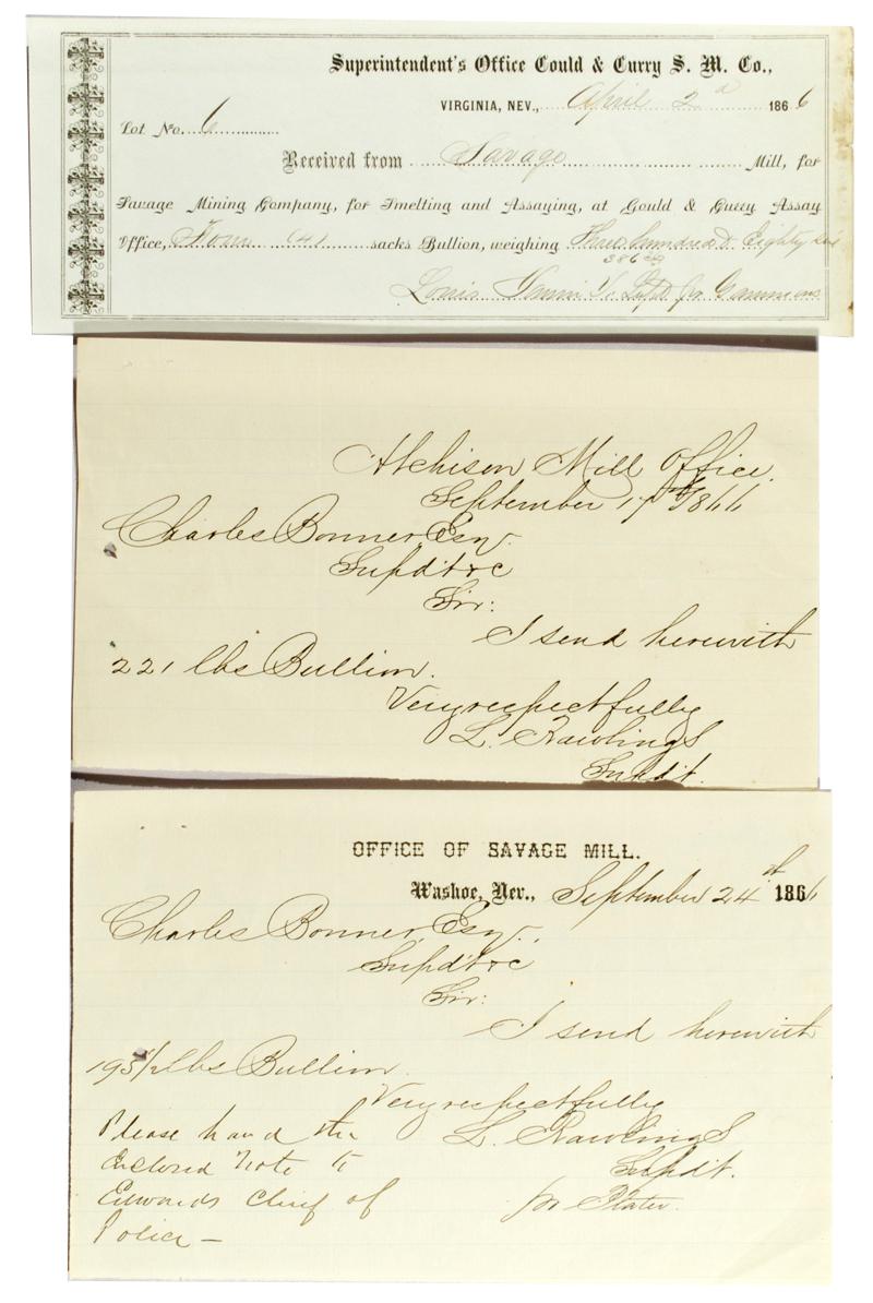 Lot of three. 1) Handwritten receipt issued Sept. 17, 1866 to Charles Bonner, Esq. For 221 lhs bullion. Atchison Mill Office noted at top right. The Atchison Mill resided in Storey County, Washoe, NV and was second in size only to the Ophir Mill. It was named for J.T. Atchison who recorded it in 1859. (REF: Carlson). Signed by Rawlings Supt. 2) Issued Sept. 24, 1866 to Charles Bonner, Esq. For 195.5 lhs bullion. Header at top: Office of Savage Mill. Named after Leonard Coates Savage after having been presented its initial stake by Henry Comstock (REF: Carlson). 3) Issued April 2, 1866 received four sacks bullion for $386.26 from the Savage Mill. Header at top: Superintendent's Office Gould & Curry S.M. Co. Signed by Rawlings Supt. Virginia, Nev. "Lot No. 6". Border at left. Fine.