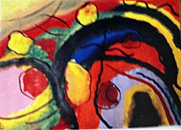 Oil on paper in the manner of Wassily Kandinsky "Improvisation N 10", circa 1913, private collection, unframed dimensions approximately 20x14. Wassily Kandinsky, Russian in full Vasily Vasilyevich Kandinsky (born December 4 [December 16, New Style], 1866, Moscow, Russia—died December 13, 1944, Neuilly-sur-Seine, France) Russian-born artist, one of the first creators of pure abstraction in modern painting. in the manner of successful avant-garde exhibitions, he founded the influential Munich group Der Blaue Reiter (“The Blue Rider”; 1911–14) and began completely abstract painting. His forms evolved from fluid and organic to geometric and, finally, to pictographic (e.g., Tempered Élan, 1944).