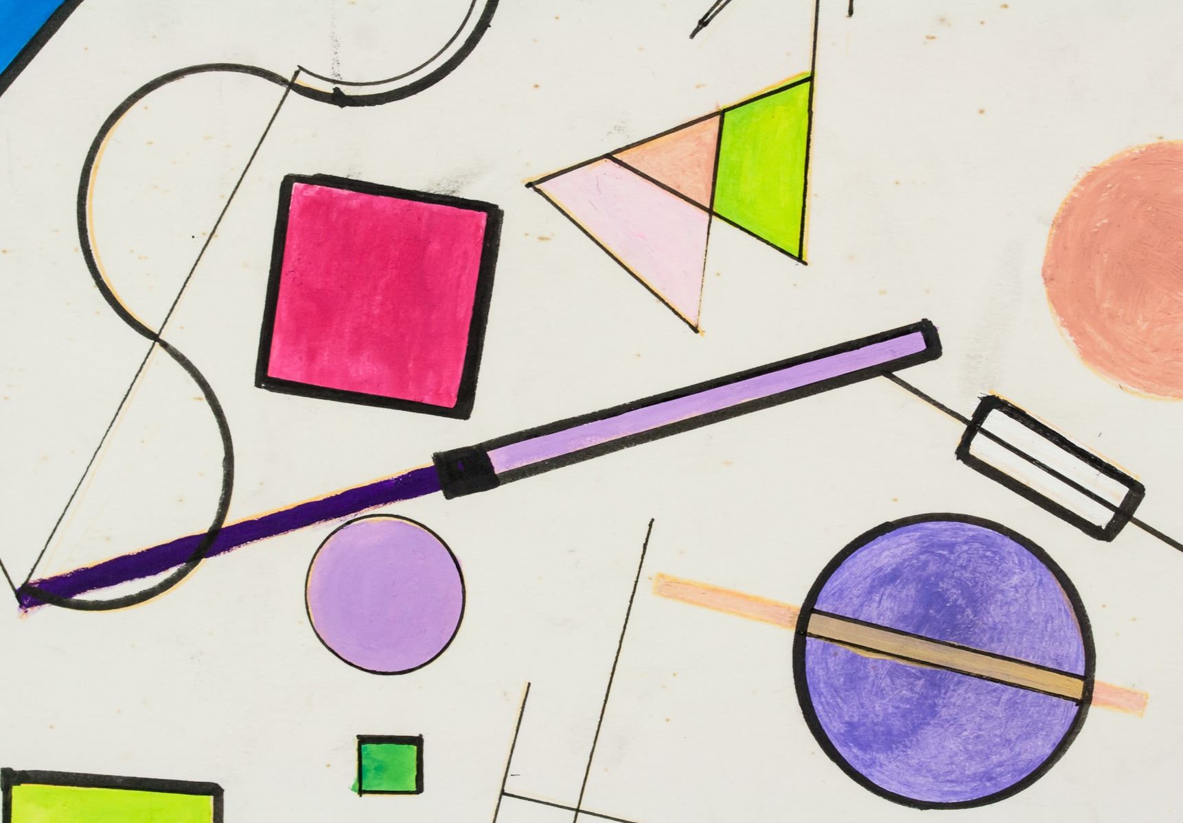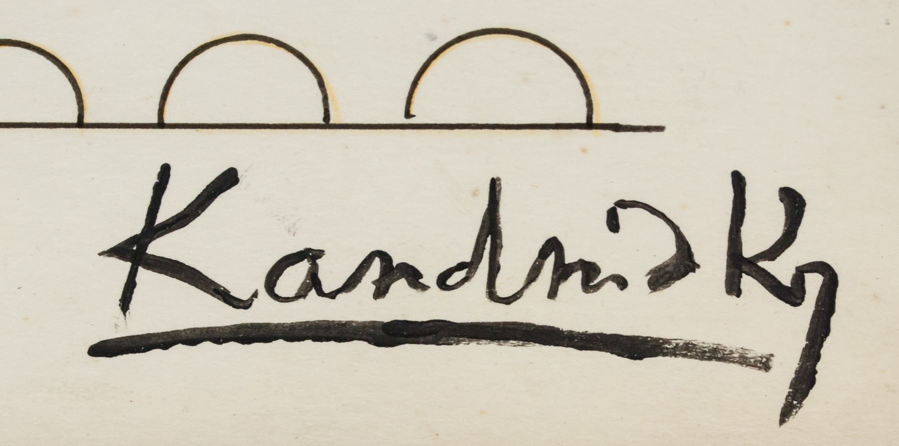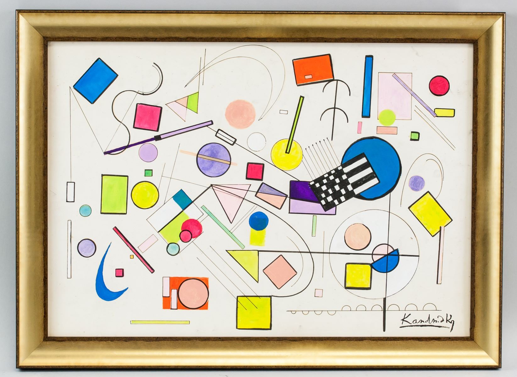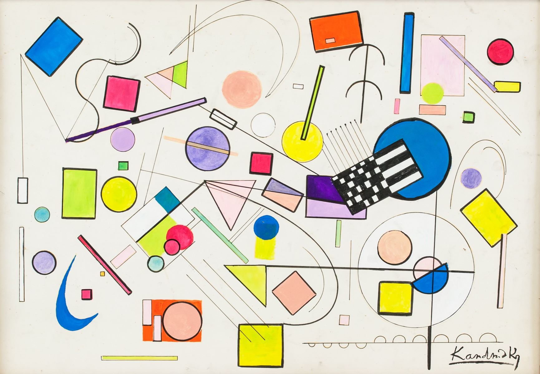 Mixed media on board, framed. Featuring abstract composition of geometric shapes. Signed "Kandinsky" in the bottom right corner. Attributed to Wassily Kandinsky (1866-1944, Russian). 34.7 x 49.5 cm (13.6 x 19.2 inches), framed size: 41 x 56 cm (16.2 x 22 inches).