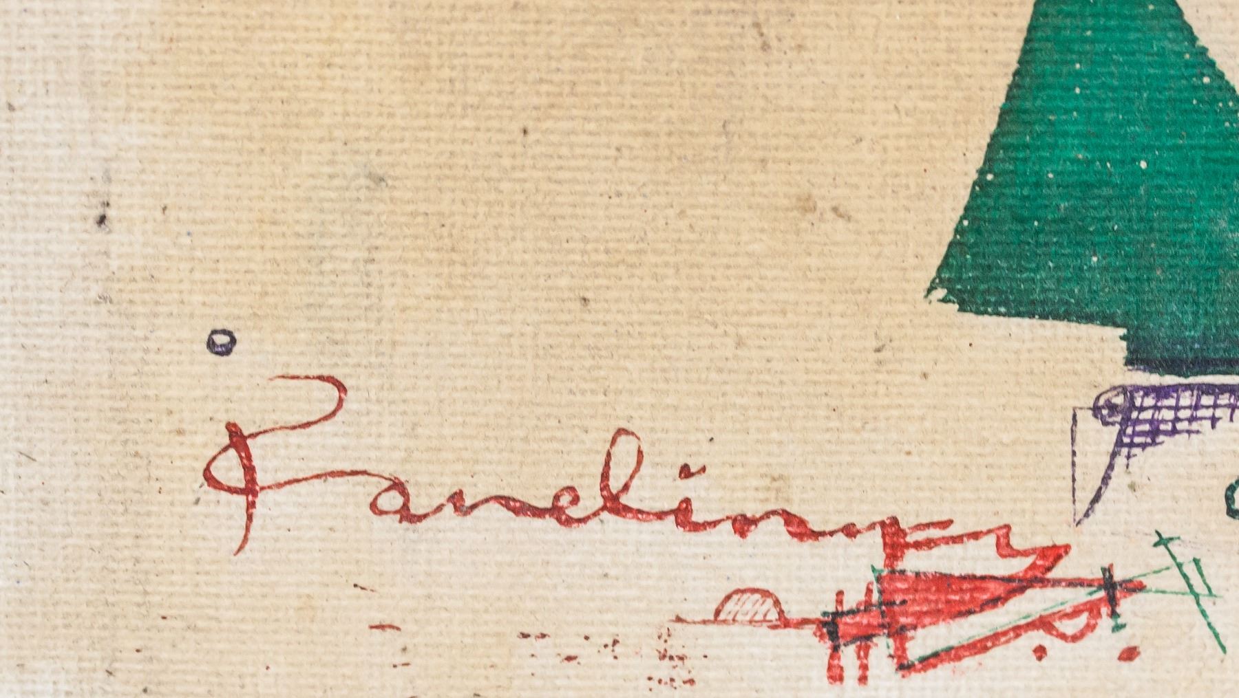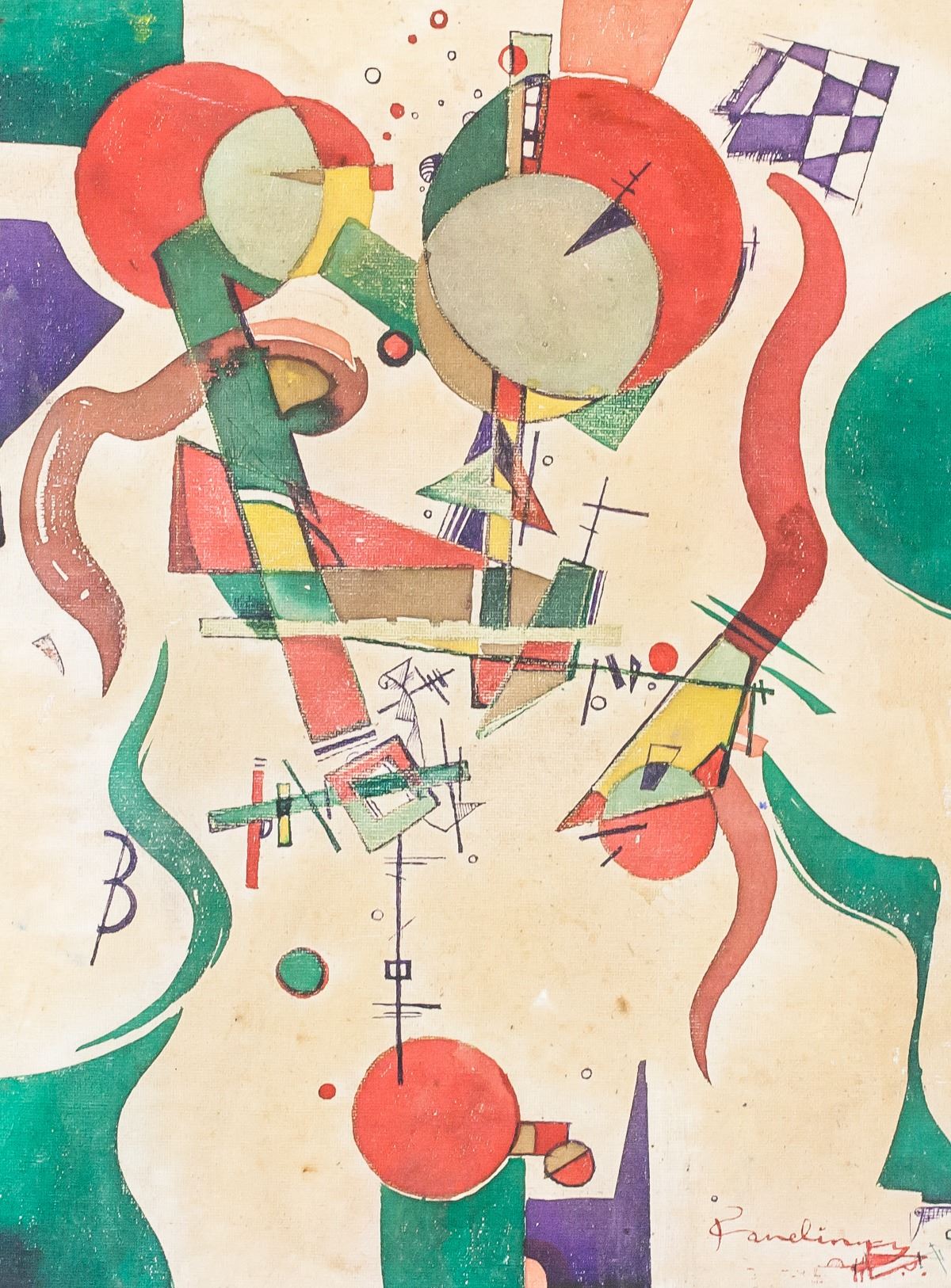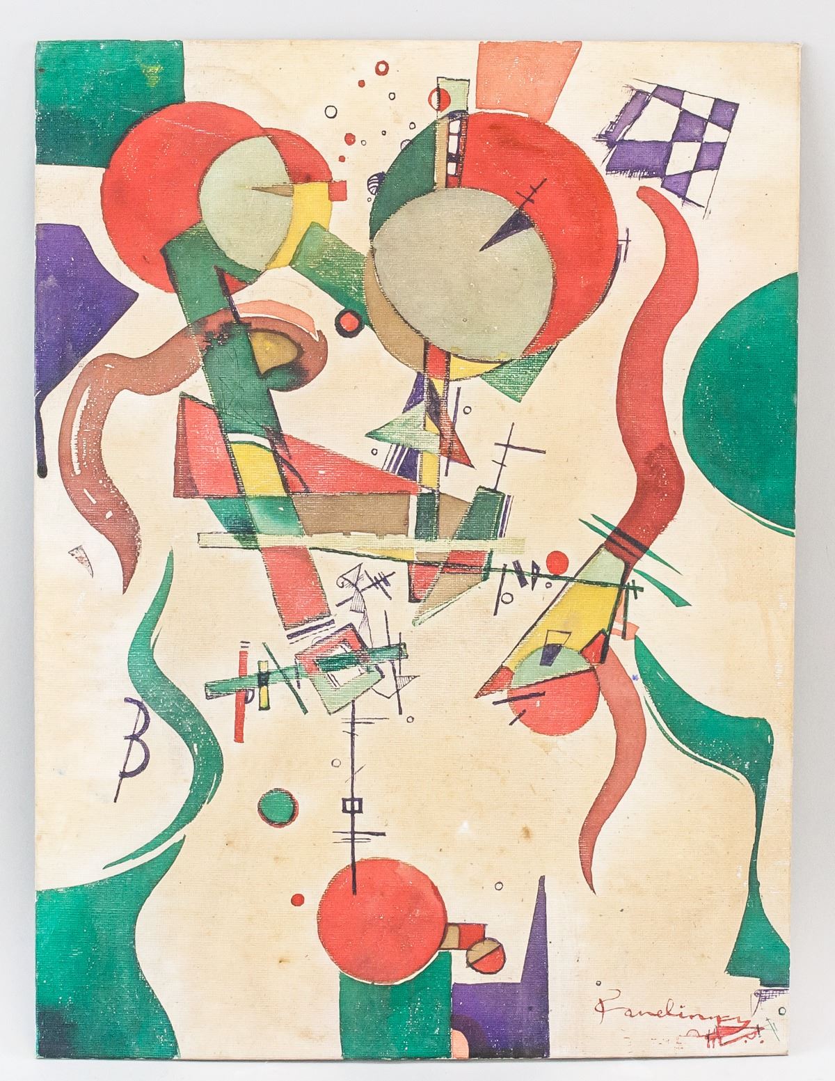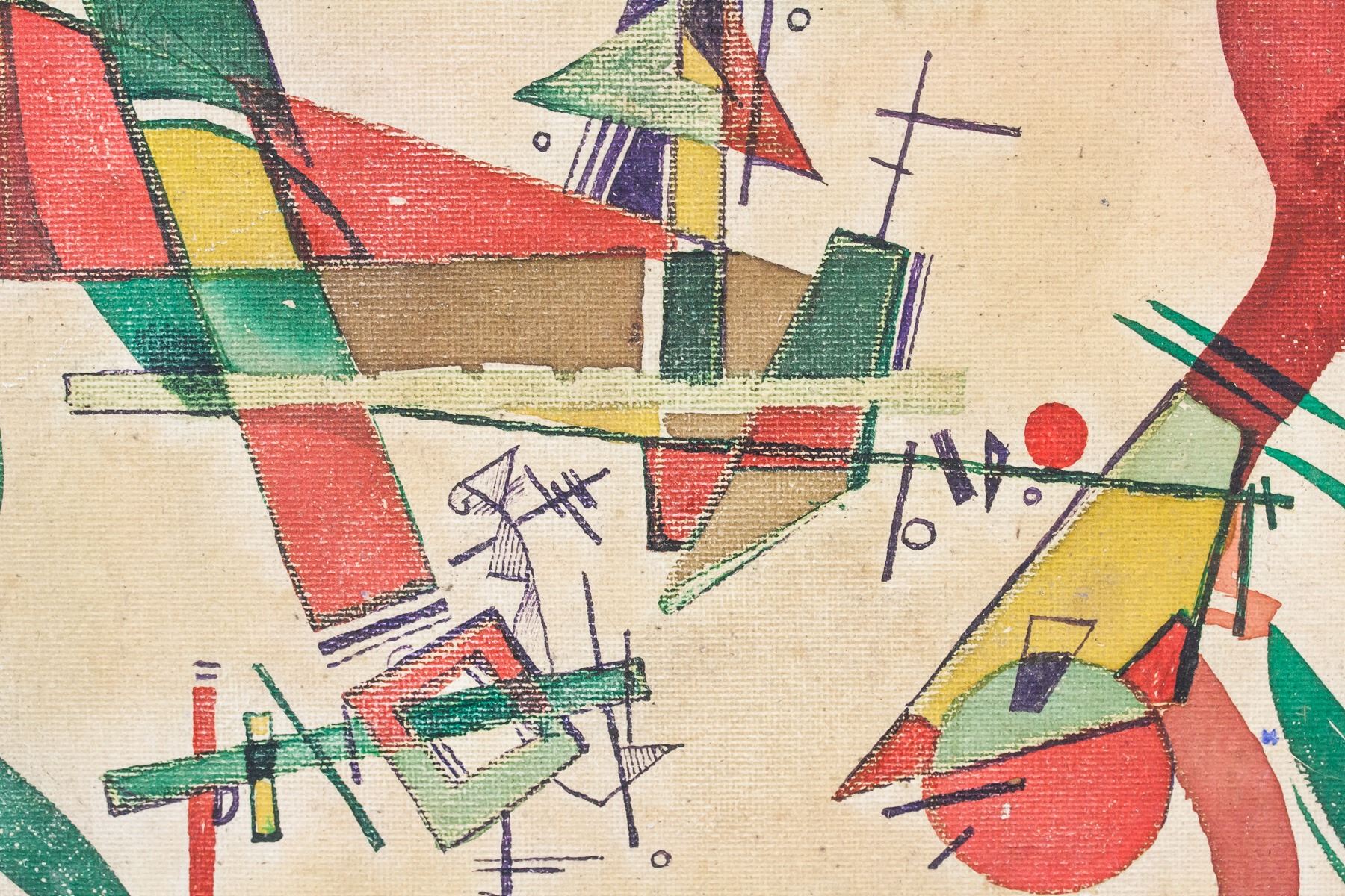 Acrylic on board. Featuring abstract composition of geometric shapes. Signed "Kandinsky" in the bottom right corner. Stamped illegibly on verso. Attributed to Wassily Kandinsky (1866-1944, Russian). 40 x 30 cm (15.75 x 12 inches).