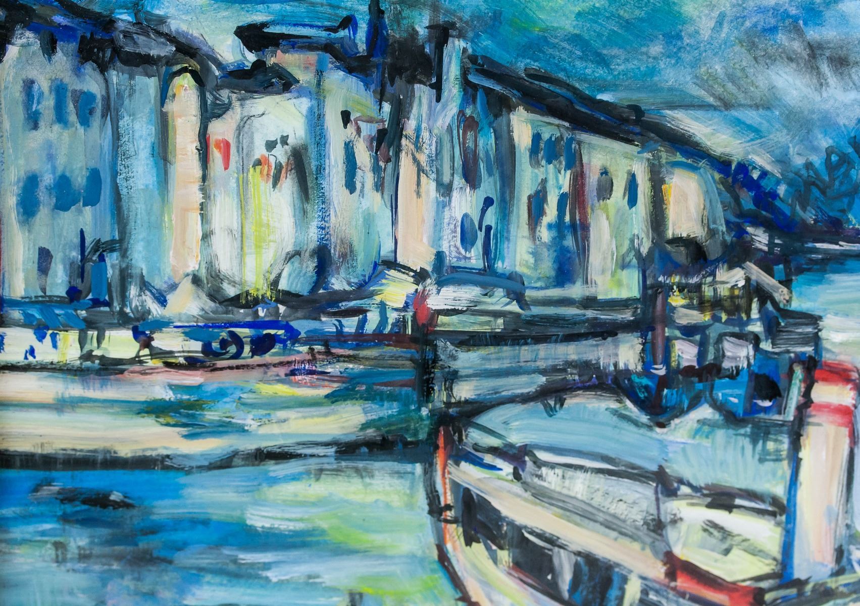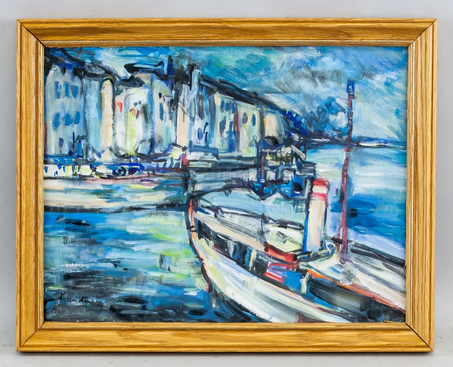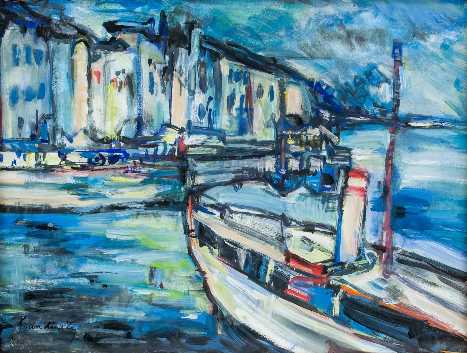 Gouache on paper, framed. Featuring a landscape scene of the harborfront. Signed Kandinsky on the lower left corner. Attributed to Wassily Kandinsky (Russian, 1866-1944). 21 x 27 cm (8.3 x 10.6 inches). Frame size: 25 x 31 cm (9.8 x 12.2 inches). PROVENANCE: Southern Ontario estate