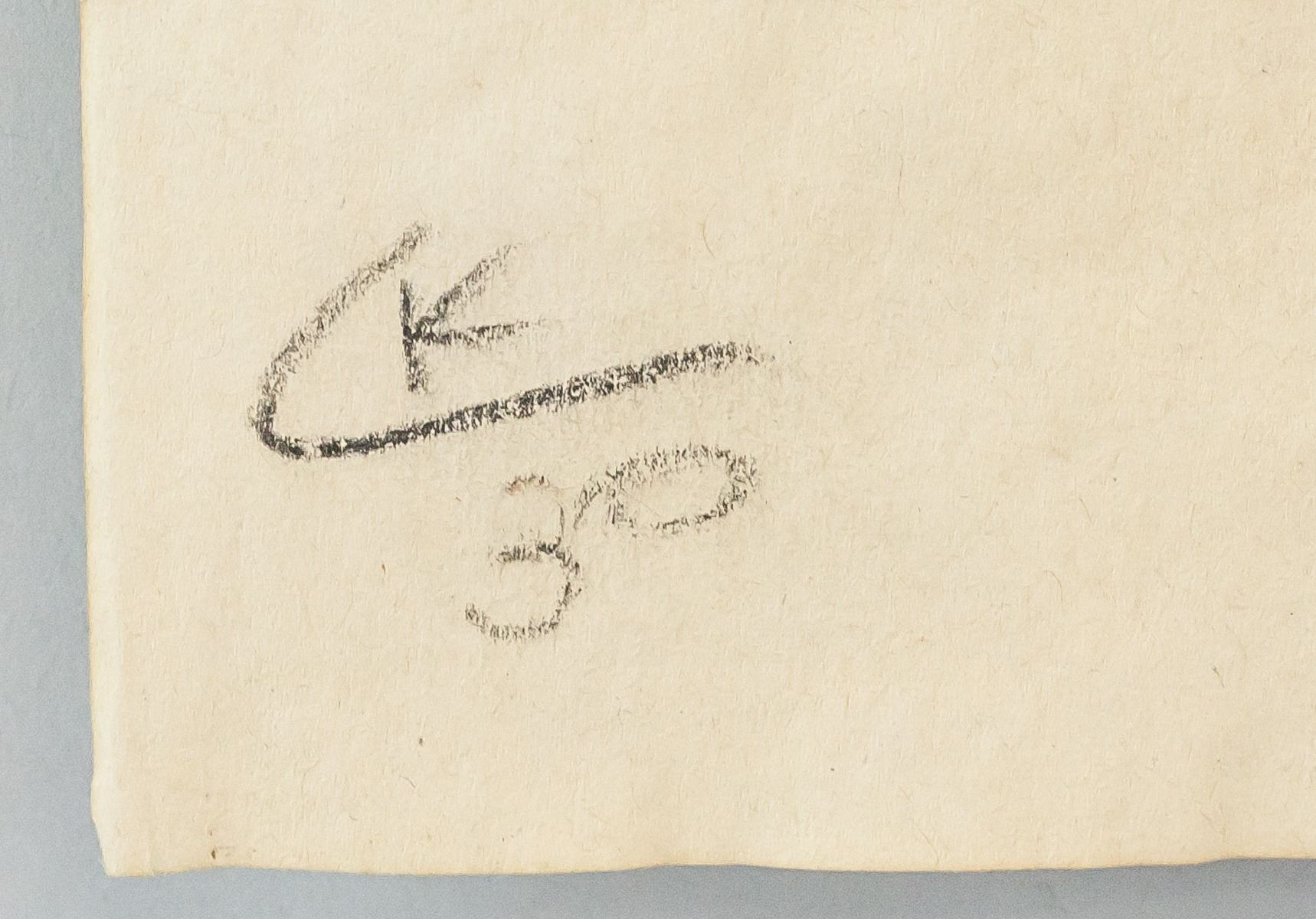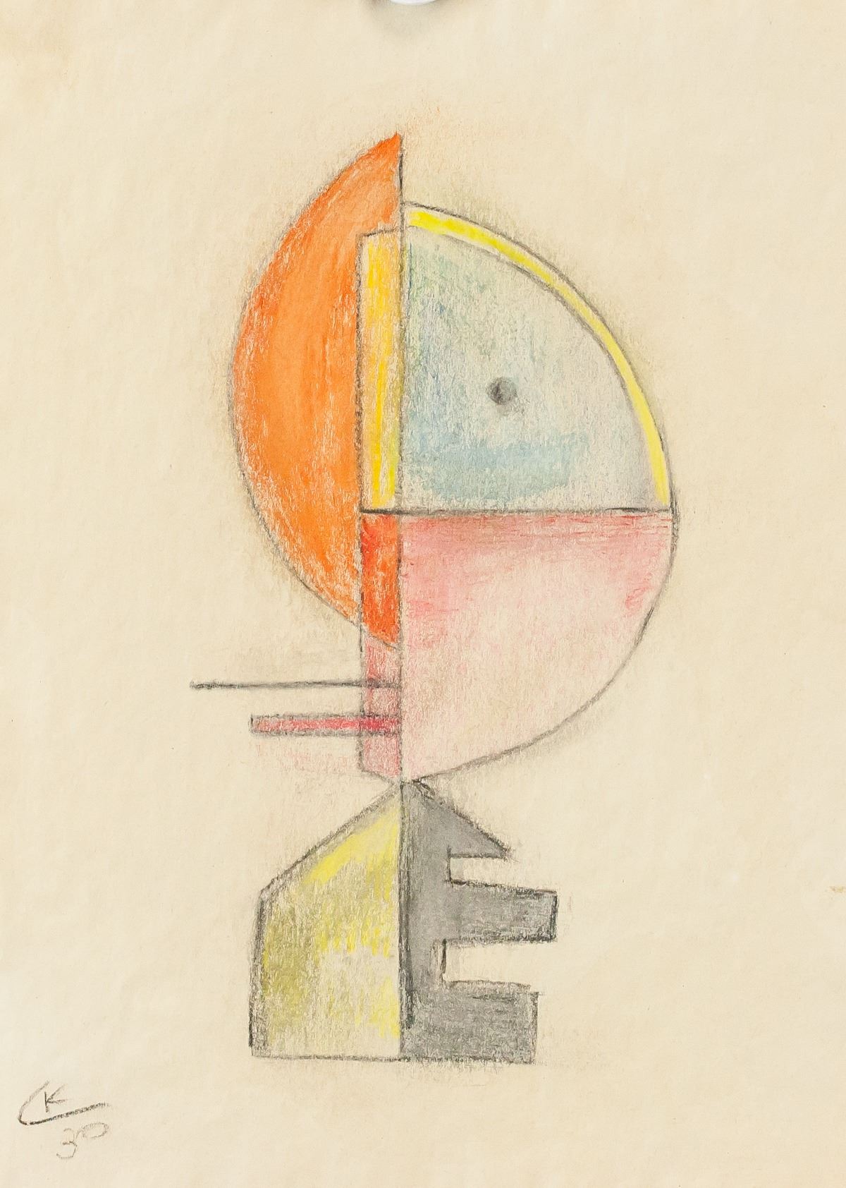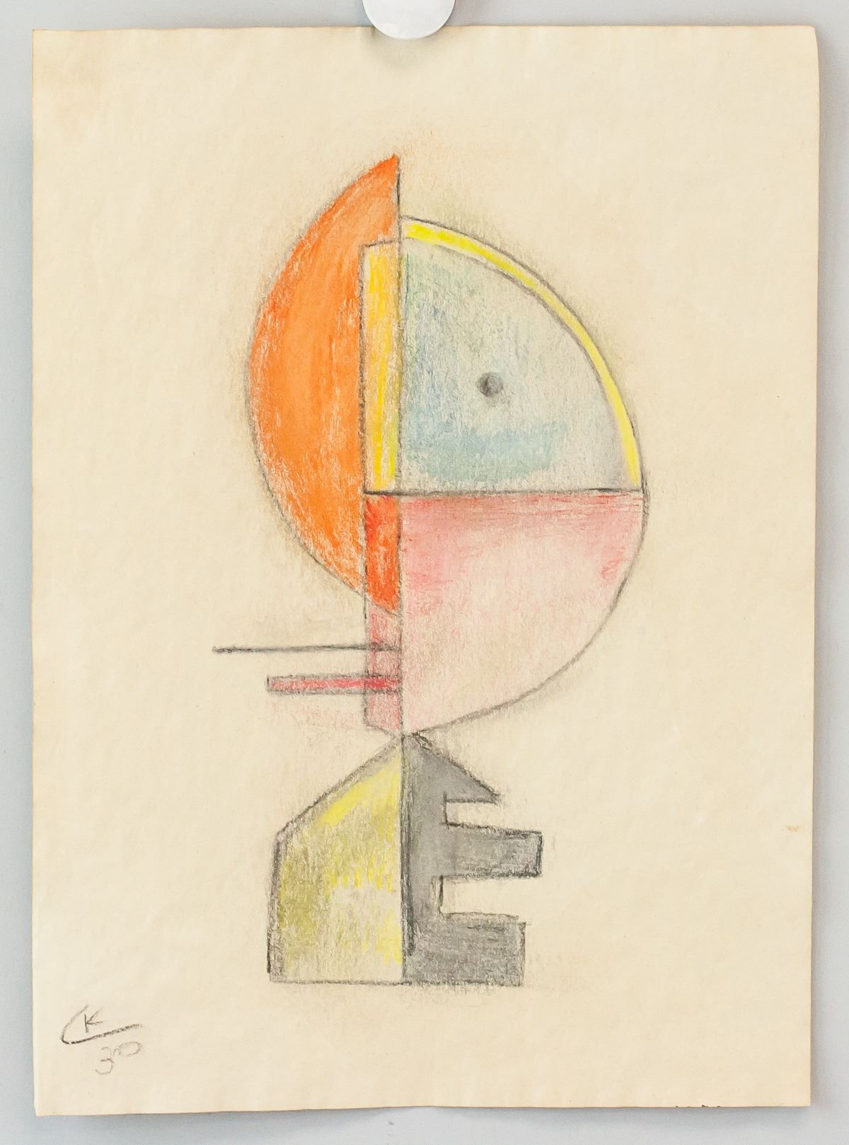 Chalk and pastel on paper. Featuring geometric abstract composition. Signed "K" in the bottom left corner, with "30" inscribed beneath the signature. "EXPOSITION D'ART D'FRANCE" stamped on verso. Attributed to Wassily Kandisky (1866-1944, Russian). 29 x 21 cm (11.5 x 8.25 in)
