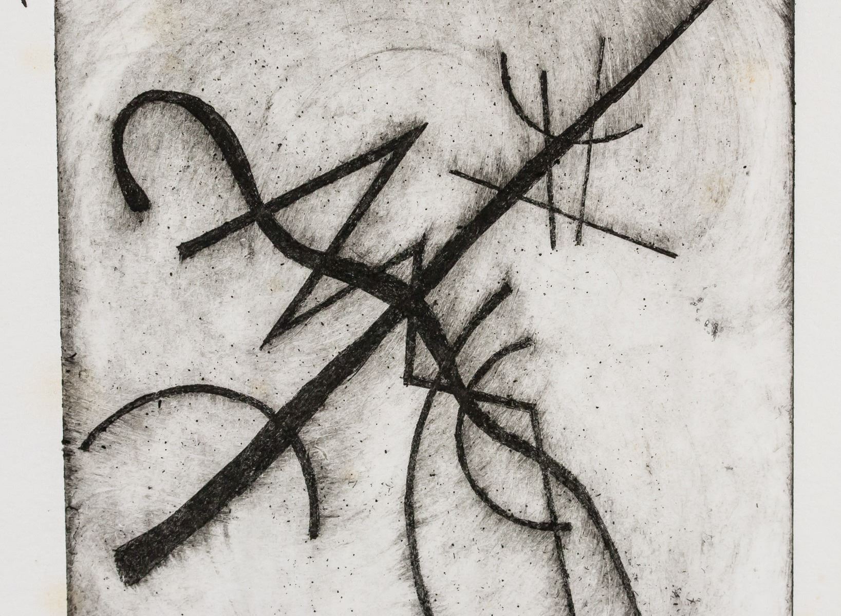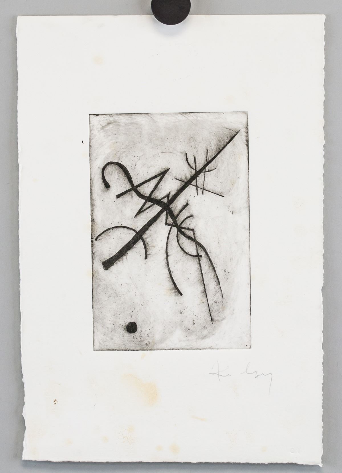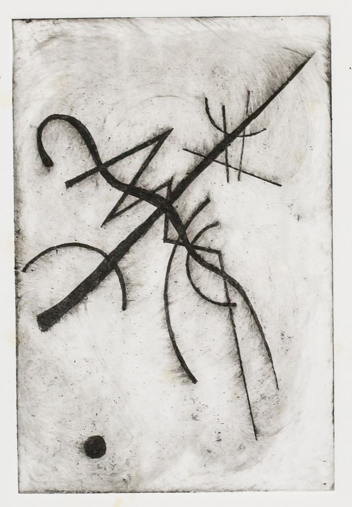 Linocut etching on paper. Featuring an abstract expressionist composition. Signed Kandinsky in pencil on the lower right corner. Stamped faintly in blue ink on verso. Chopmark on the lower right corner. Attributed to Wassily Kandinsky (1866-1944, Russian). 28 x 19 cm (11 x 7.5 inches). Provenance: This lot carries limited provenance from a Southern Italian estate