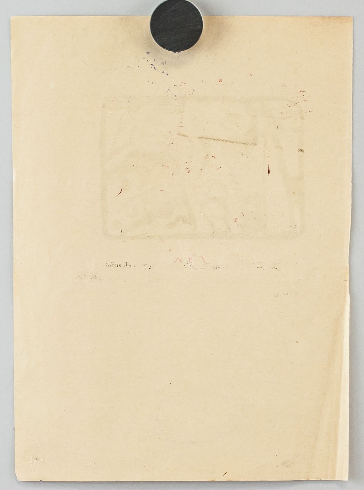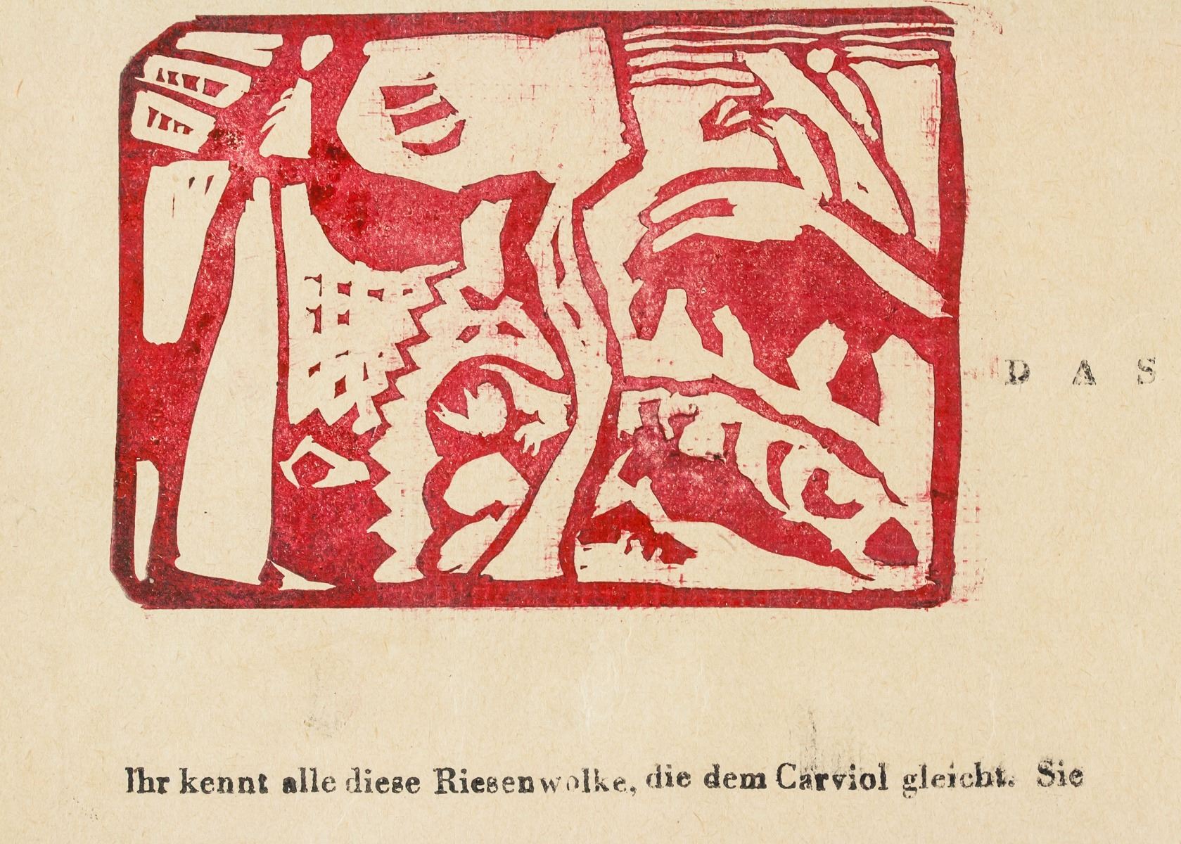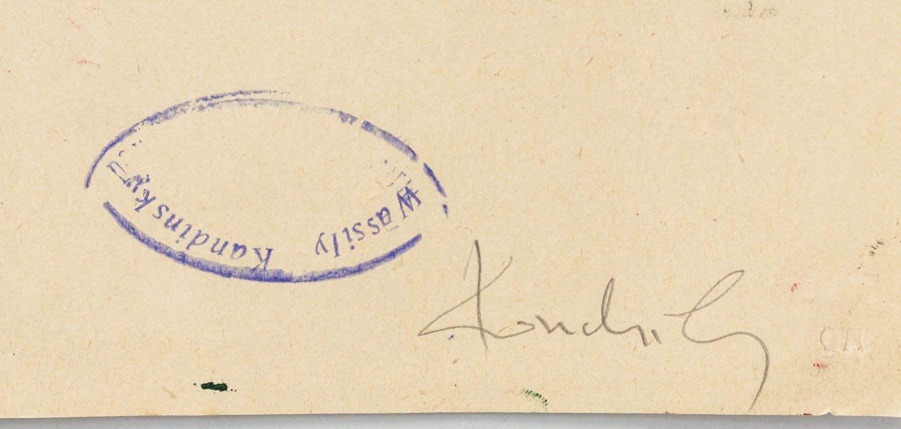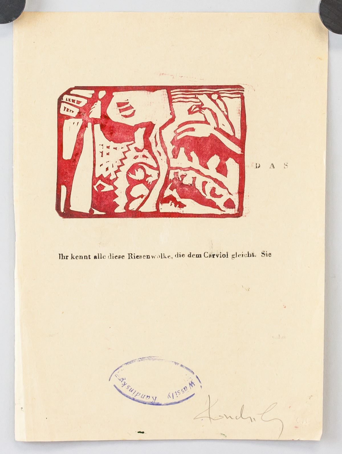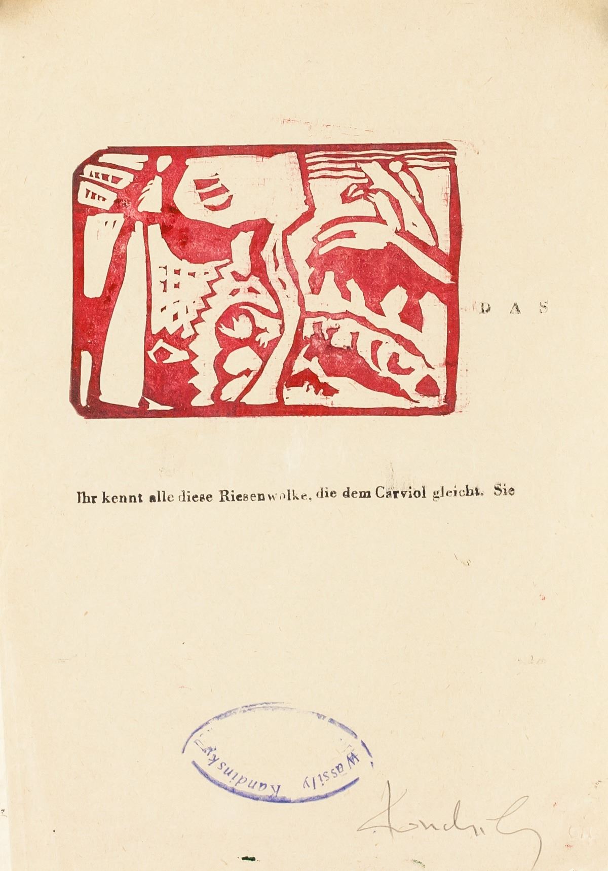 Linocut on paper. Featuring abstract image printed in red. Stamped "Wassily Kandinsky" beneath the image. Signed "Kandinsky" in the bottom right corner. Attributed to Wassily Kandsinky (1866-1944, Russian). 22 x 16 cm (8.75 x 6.25 inches).