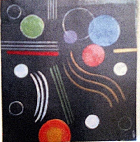 Oil on paper in the manner of Wassily Kandinsky "The Circles", circa 1937, private collection, unframed dimensions approximately 14x13. Wassily Kandinsky, Russian in full Vasily Vasilyevich Kandinsky (born December 4 [December 16, New Style], 1866, Moscow, Russia—died December 13, 1944, Neuilly-sur-Seine, France) Russian-born artist, one of the first creators of pure abstraction in modern painting. in the manner of successful avant-garde exhibitions, he founded the influential Munich group Der Blaue Reiter (“The Blue Rider”; 1911–14) and began completely abstract painting. His forms evolved from fluid and organic to geometric and, finally, to pictographic (e.g., Tempered Élan, 1944).