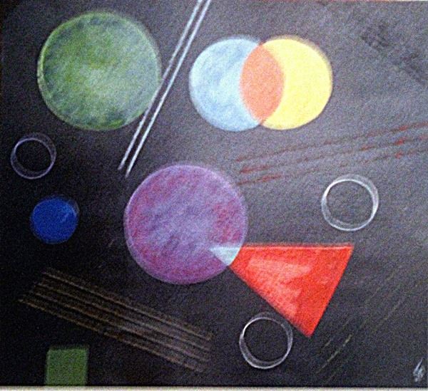 Oil on paper in the manner of Wassily Kandinsky "The Circles", circa 1939, private collection, unframed dimensions approximately 14x13. Wassily Kandinsky, Russian in full Vasily Vasilyevich Kandinsky (born December 4 [December 16, New Style], 1866, Moscow, Russia—died December 13, 1944, Neuilly-sur-Seine, France) Russian-born artist, one of the first creators of pure abstraction in modern painting. in the manner of successful avant-garde exhibitions, he founded the influential Munich group Der Blaue Reiter (“The Blue Rider”; 1911–14) and began completely abstract painting. His forms evolved from fluid and organic to geometric and, finally, to pictographic (e.g., Tempered Élan, 1944).