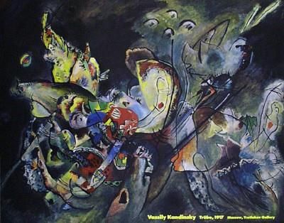 Artist: Wassily KandinskyTitle: Trube, 1917Medium: PrintSize: 35 1/2" x 45"Condition: ExcellentBiography * Kandinsky, Wassily (1866- 1944), Russian-born artist, one of the first * creators of pure abstraction in modern painting. After successful avant-garde * exhibitions, he founded the influential Munich * group Der Blaue Reiter (The Blue Rider; 1911-14) and began * completely abstract painting. His forms evolved from fluid and organic to * geometric and, finally, to pictographic ( e.g., Tempered Élan, * 1944). * * Kandinsky, himself an accomplished musician, once said Color is the * keyboard, the eyes are the harmonies, the soul is the piano with many strings. * The artist is the hand that plays, touching one key or another, to cause * vibrations in the soul. The concept that color and musical harmony are * linked has a long history, intriguing scientists such as Sir Isaac Newton. * Kandinsky used color in a highly theoretical way associating tone with timbre * (the sound's character), hue with pitch, and saturation with the volume of * sound. He even claimed that when he saw color he heard music. * * * *