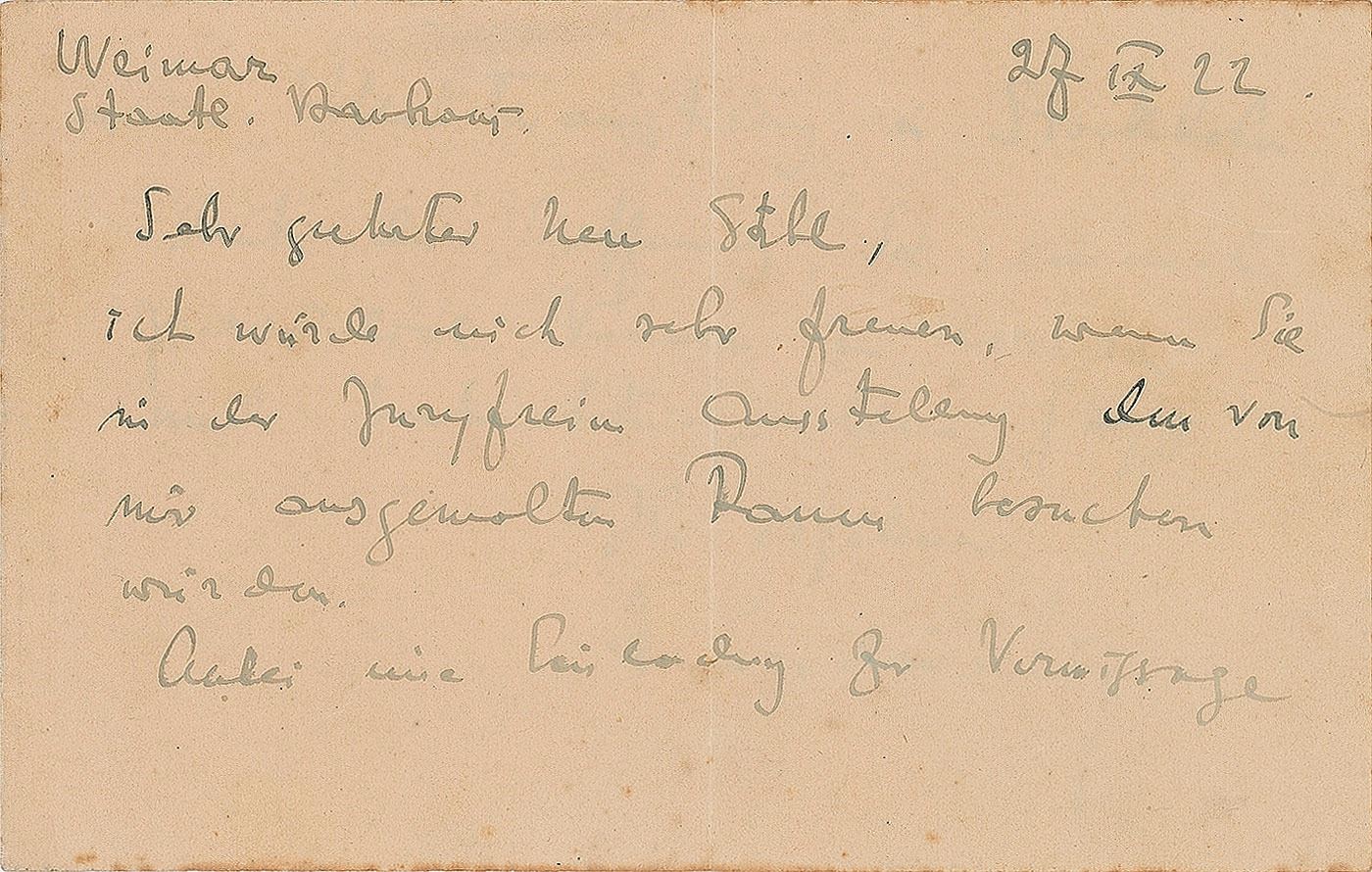 Pioneering Russian artist (1866–1944) who takes a place among the seminal figures in the development of abstract art. ALS in German, signed “Kandinsky,” two pages on two adjoining sheets, 6.5 x 4, September 27, 1922. Untranslated letter written from the famed art school Bauhaus, where he began teaching that year. In fine condition, with a central vertical fold and scattered light foxing.