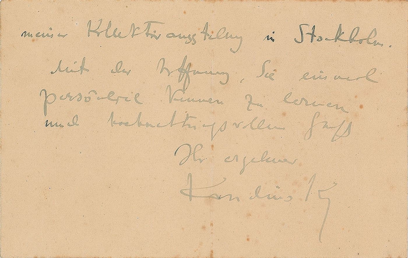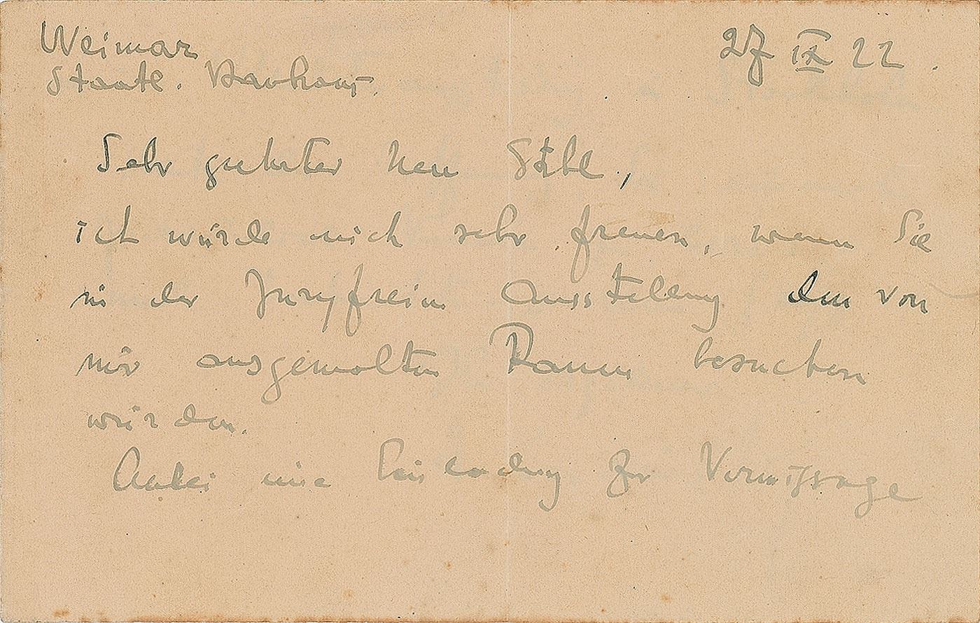 ALS in German, signed “Kandinsky,” two pages on two adjoining sheets, 6.5 x 4, September 27, 1922. Letter written from the famed art school Bauhaus, where he began teaching that year. Kandinsky congratulates a friend of his for attending the 1922 Juryfreie Kunstausstellung [Jury-Free Art Exhibition] in Berlin. In fine condition, with a central vertical fold and scattered light foxing.