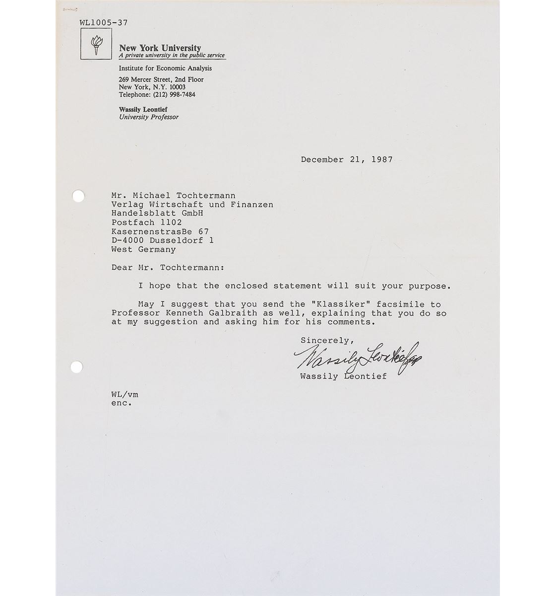 American economist (1906–1999) who received the Nobel Memorial Prize in Economic Sciences in 1973. TLS, one page, 8.25 x 11, personal letterhead, December 21, 1987. Letter to Michael Tochtermann, in full: “I hope that the enclosed statement will suit your purpose. May I suggest that you send the ‘Klassiker’ facsimile to Professor Kenneth Galbraith as well, explaining that you do so at my suggestion and asking him for his comments.” In fine condition, with a pair of punch holes to left edge and staple holes to top left corner. Accompanied by the aforementioned enclosed statement.