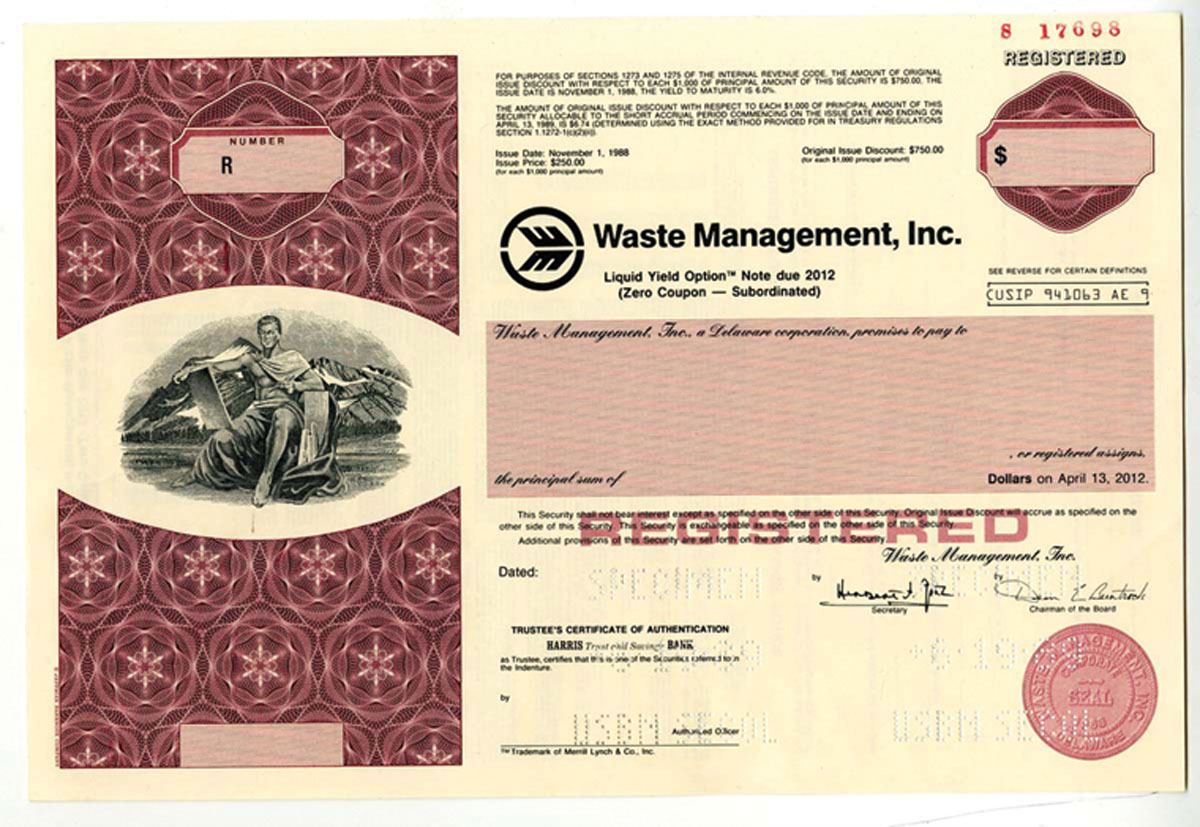 Waste Management, Inc. 1989 $Odd Specimen Zero Coupon Registered Bond, XF JBN. National trash collecting company.