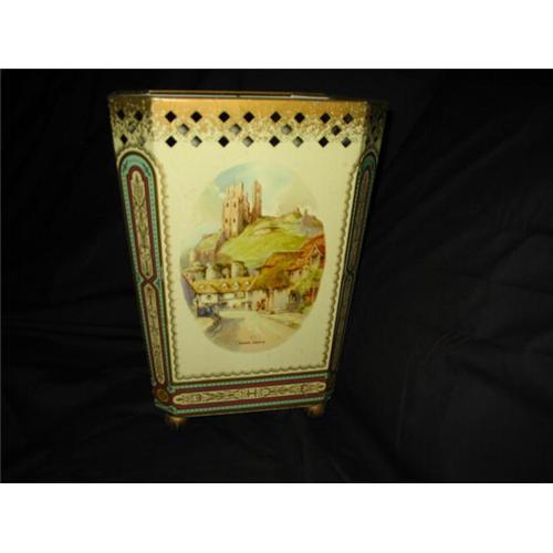 History, allure and style depicted of quaint and charming English country side is depicted ever so pretty on this tin ware waste paper basket. Arundel Castle in West Sussex, England over 1,000 years old and Corfe Castle in Dorset, England which started as a Roman Settlement are each shown on 2 sides. It has stamped on the bottom, "Baret Ware (crest that says Art and Grace) Made in England "Regal Waste Paper Basket No 161 c B.W.Co to Clean Simply Wipe with a Damp Cloth"