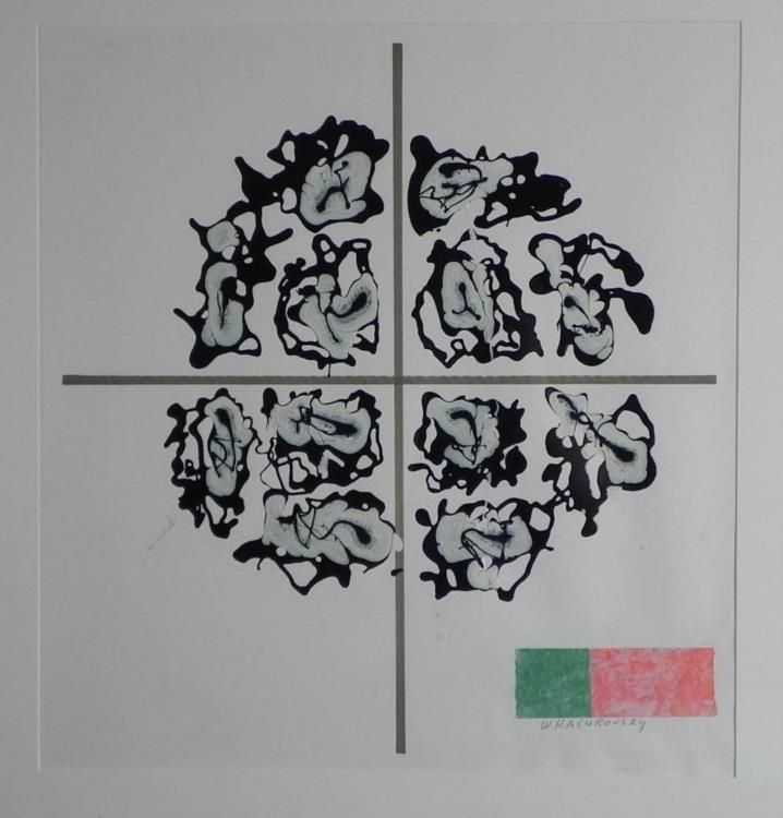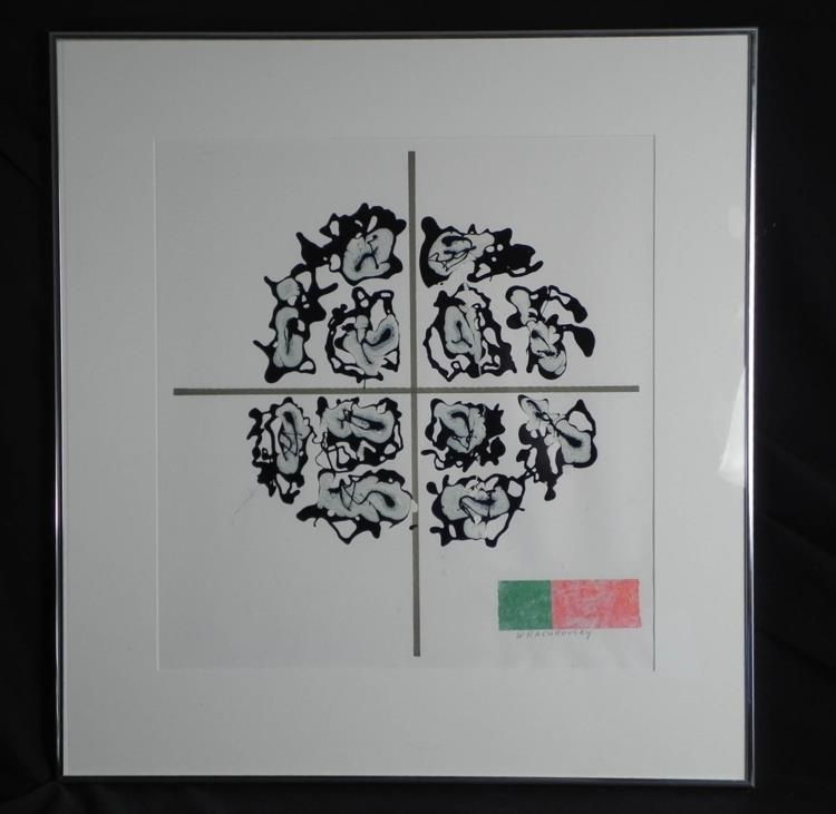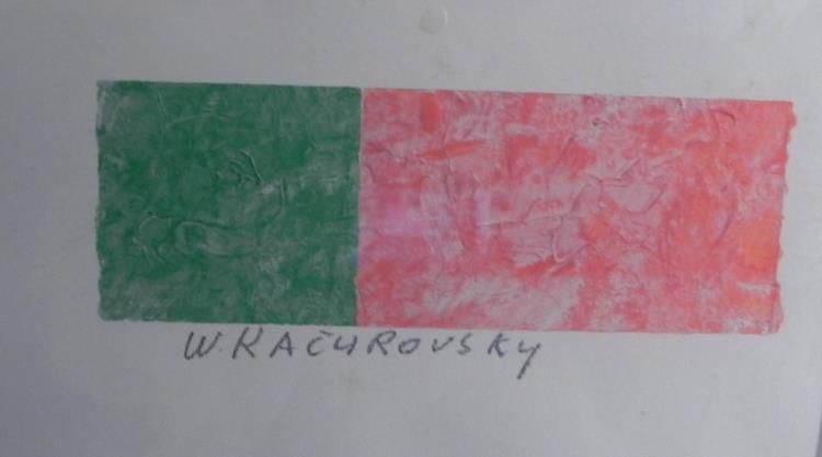 Offered is a Wasyl Kacurovsky signed original piece of artwork. It is an oil painting on canvas. It is framed with SUV plexiglas. There is a slightly whiter color around the red and green in the corner. --- Artist: Wasyl Kacurovsky - Signature: Kacurovsky in pencil in bottom right corner - Title: untitled - Medium: oil painting on canvas- Sheet size: 18"x19" - Frame: 25x27 - Year: 1970's - Condition: Excellent --- Universal Live has been entrusted by the estate of Wasyl Kacurovsky to offer his personal artwork for public sale. This represents a treasure trove of his personal work as submitted by his nephew, the administrator of his estate. It was his wish and legacy that others should enjoy what he enjoyed. --- Wasyl Kacurovsky (1905-2000) worked in oil paints and mixed media, created sculptures that puzzled and entertained, and painted rocks and baseball caps. His work mixed shapes, textures, colors, and media, and focused particularly on modern art. Born in 1905 in North Dakota, Wasyl and his family shortly returned to Czechoslovakia, where he spent most of his life in Prague. He attended boarding schools as a youth and graduated from the Prague School of Economics in 1930. He remained in Prague during the German occupation, but fled when the war ended and Soviet troops began their takeover. After spending 4 years in refugee camps, he eventually made it to Chicago, where he began experimenting with art, particularly modernism. In 1972 he met several other like-minded Ukrainian artists and opened the Ukrainian Art Institute, where he was the curator. Over the years he created more than 200 oil paintings along with a great many other pieces of work. "His paintings are intellectual and deliberate, yet highly experimental in his use of technique and medium within the boundaries of a canvas". Mr. Kacurovsky passed away in 2000 in Chicago. His works were mainly sold and displayed in art galleries around Chicago.