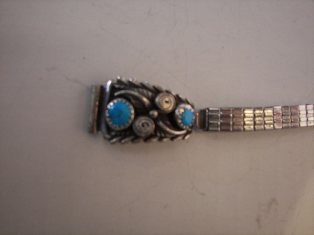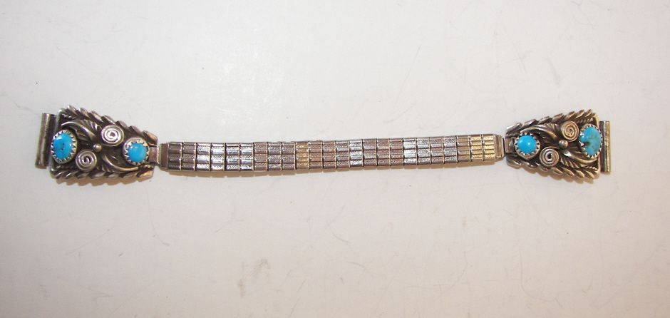 (7698) Watch Band Turquoise And Silver, 5 3/8" Long, Speidel Type Expanding Band Signed " B .", Sterling
