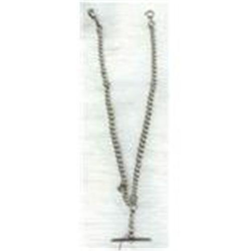 Sterling watch chain Total Length 16" with a 1" TBar chain and 1/2" Fob chain. Each link bears the lion sterling mark and the full hallmark is on the Tbar. It is a double watch chain.