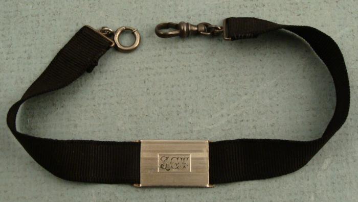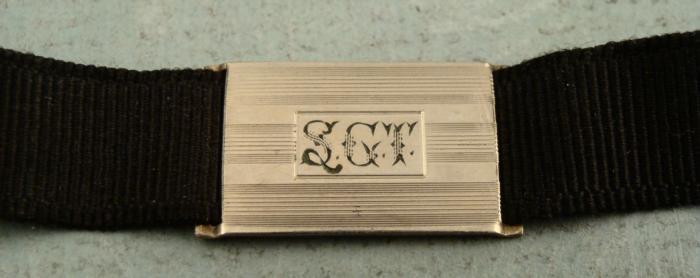 This watch fob piece has a black fabric band with silver tone metal center engraved with the initials SGT. The ends have a clasp, and a loop. It is 8 1/2" long. The center has normal light wear, and overall it in excellent condition. It is vintage, and dates from around the 1940's.