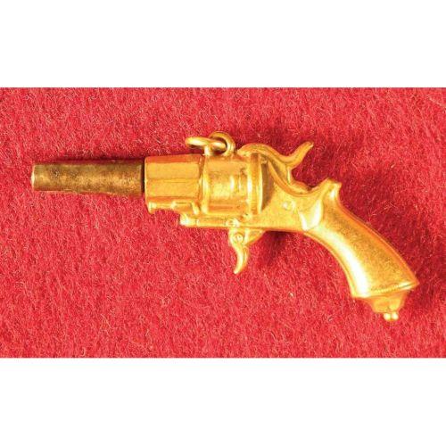 Watch Fob and Watch Key in the shape of a pistol, gold wash. Excellent condition. 1 3/4 inches long.
