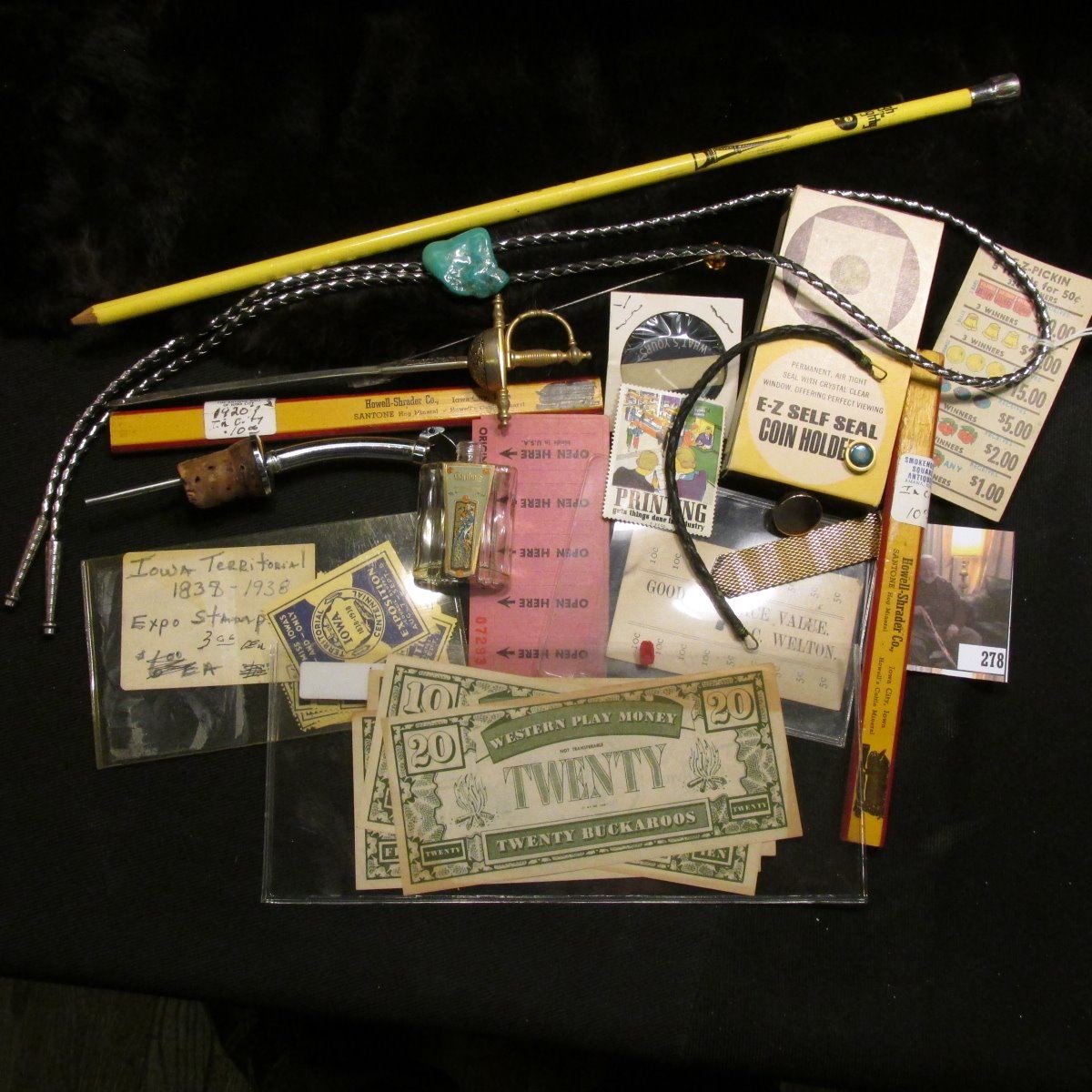 Watch Mesh Chain for a Fob; miniature Sword; Hat Pin; small perfume with no cap; braided leather watch chain; Pin-back "My Name is…"; "Printing" seal; Box of Self Seal Coin holders; wine bottle cork; (3) "E-Z-Pickin" Lottery tickets; group of Iowa Territorial Exposition seals; "Good For Face Value C. Welton" punch ticket; pair of Iowa City Carpenter advertising pencils; long advertising pencil; Western Play Money; & an attractive Bolo Tie with Turquoise slide.