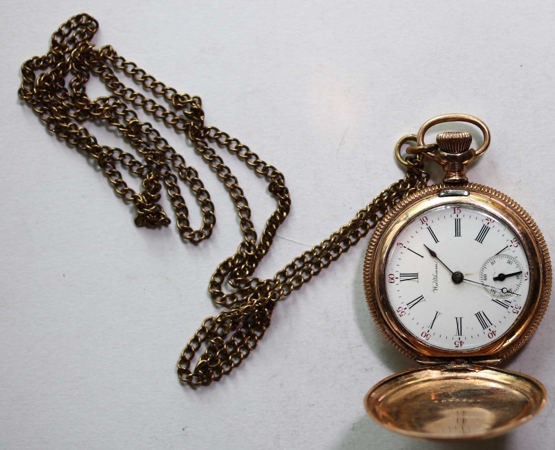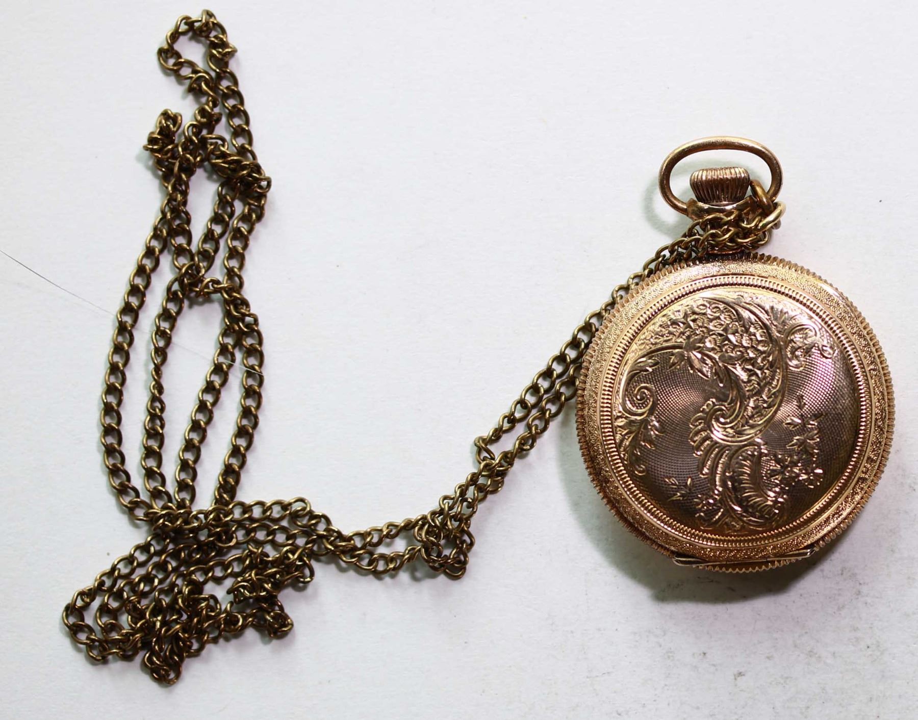 Watch; Pocket watch - "Waltham" Model 1896 Gold, Size O, 25 year Keystone Case, 14Kt. Nicely engraved. SN#7853864, 17 Jewels.