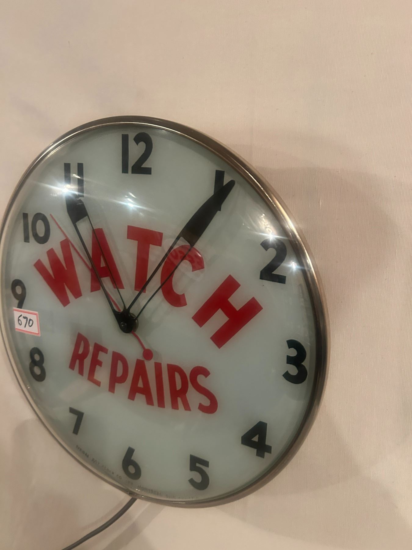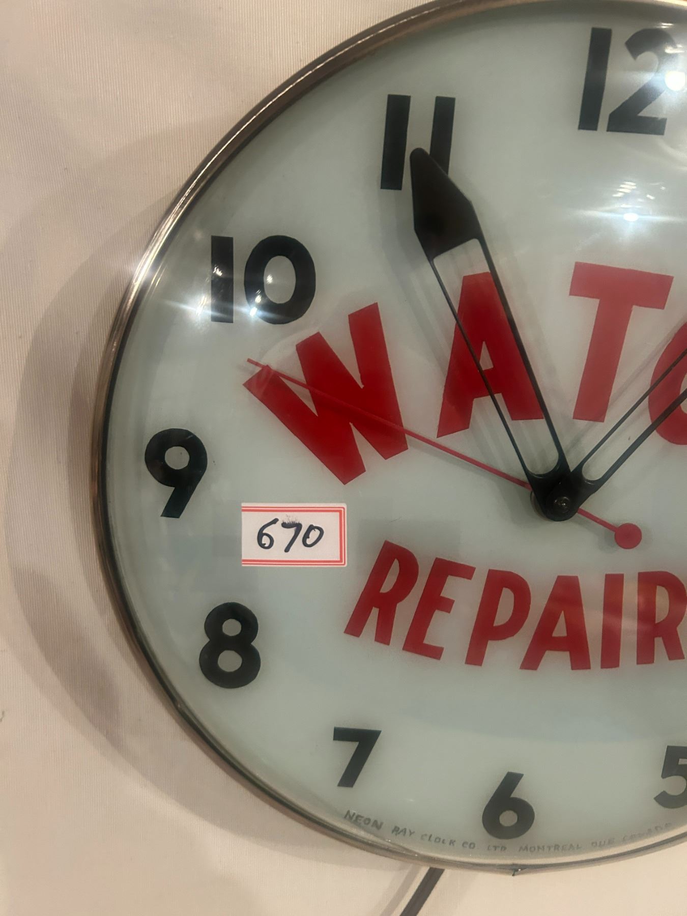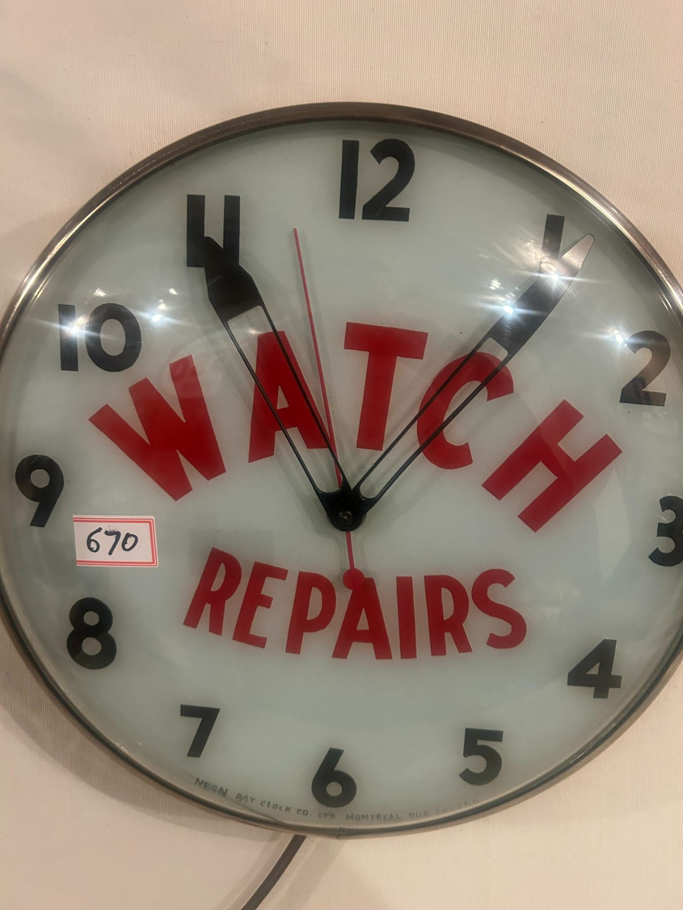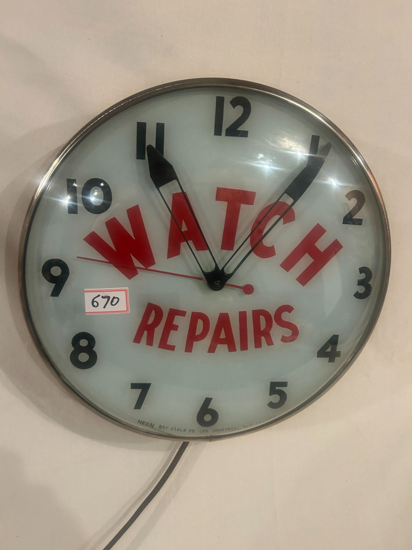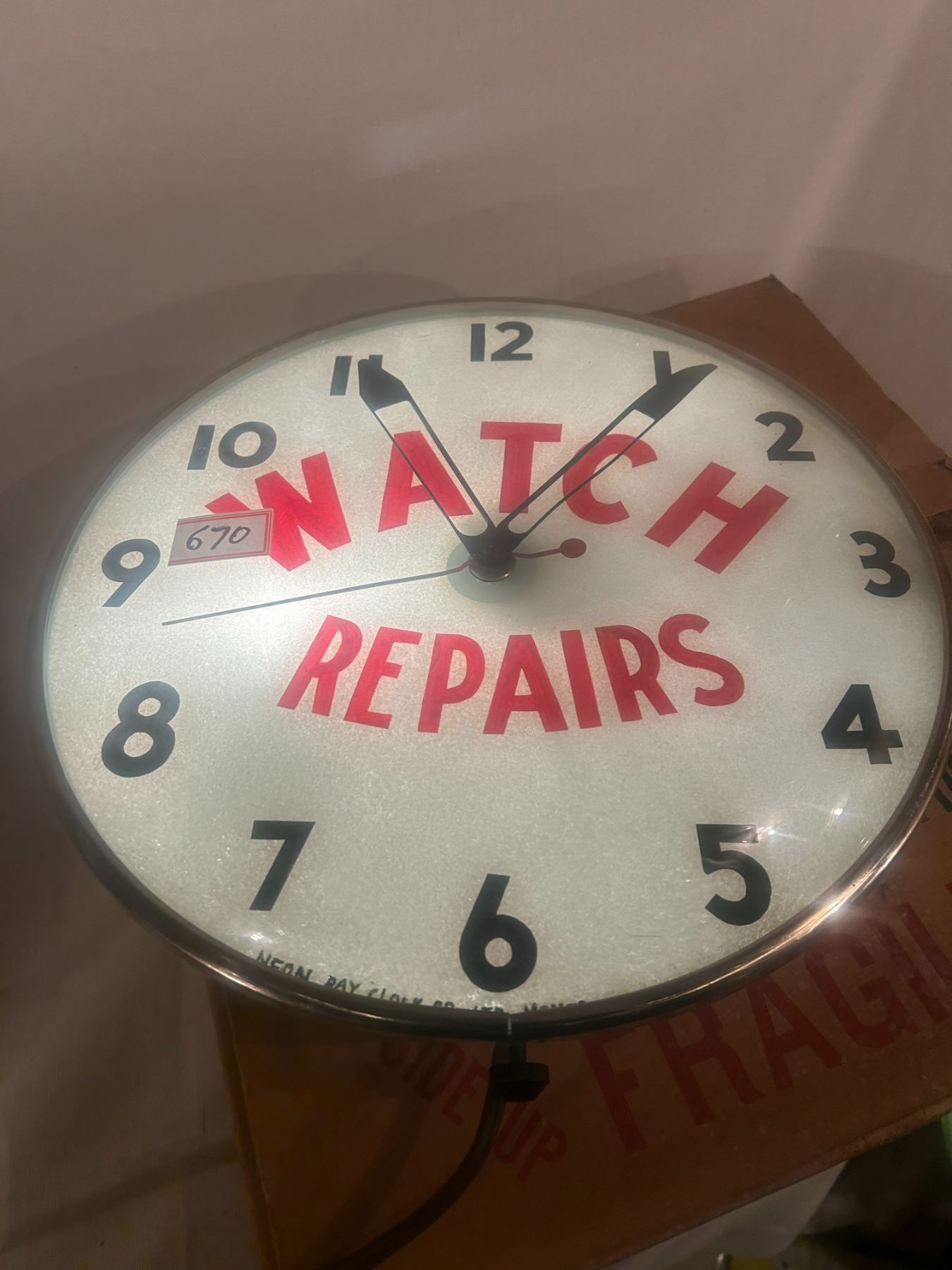 Watch Repairs clock - 14-1/2" across, working, original, Neon Ray Clock Comp., with original box