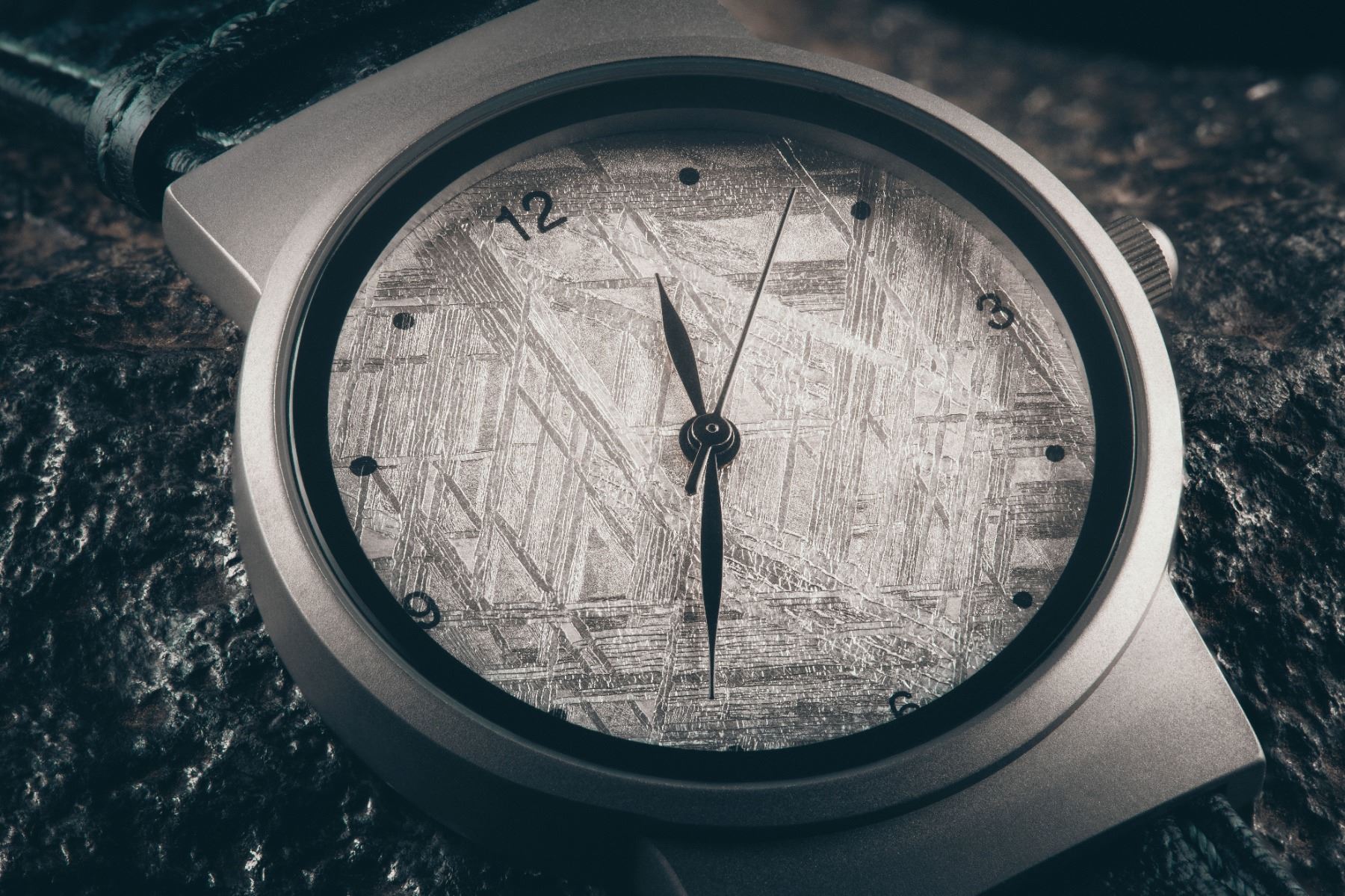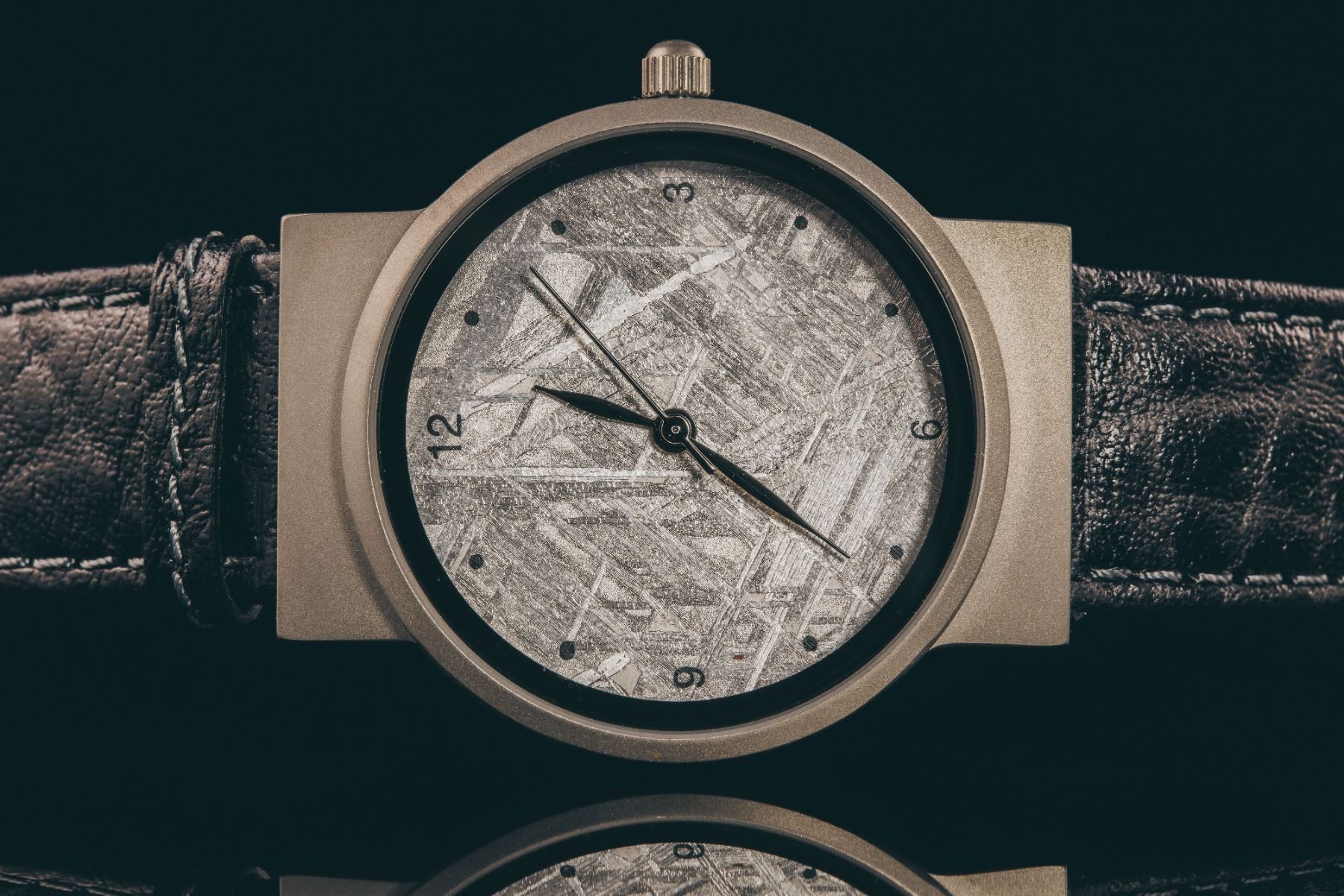 Iron meteorite, IVA. Arctic Circle, near Muonionalusta Island, Sweden, first known 1906. Wristwatch with meteorite face. A slice of this Arctic Circle meteorite has been fashioned into the face for this fully-functioning wrist watch. Meteorites found in remote and nearly inaccessible locales seem to hold a special allure for hunters and collectors alike. Muonionalusta is no exception. The fall site lies north of the Arctic Circle in Sweden and the meteorites found there are so ancient their fall pre-dates at least one ice age.
