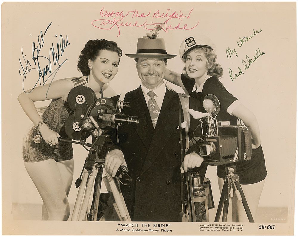 Vintage glossy 10 x 8 MGM promotional photo for Watch the Birdie, signed later in ink and felt tip by Arlene Dahl, Red Skelton, and Ann Miller, who inscribes to Bill. In very good condition, with scattered creases, surface marks, and impressions and a lightly trimmed right edge.