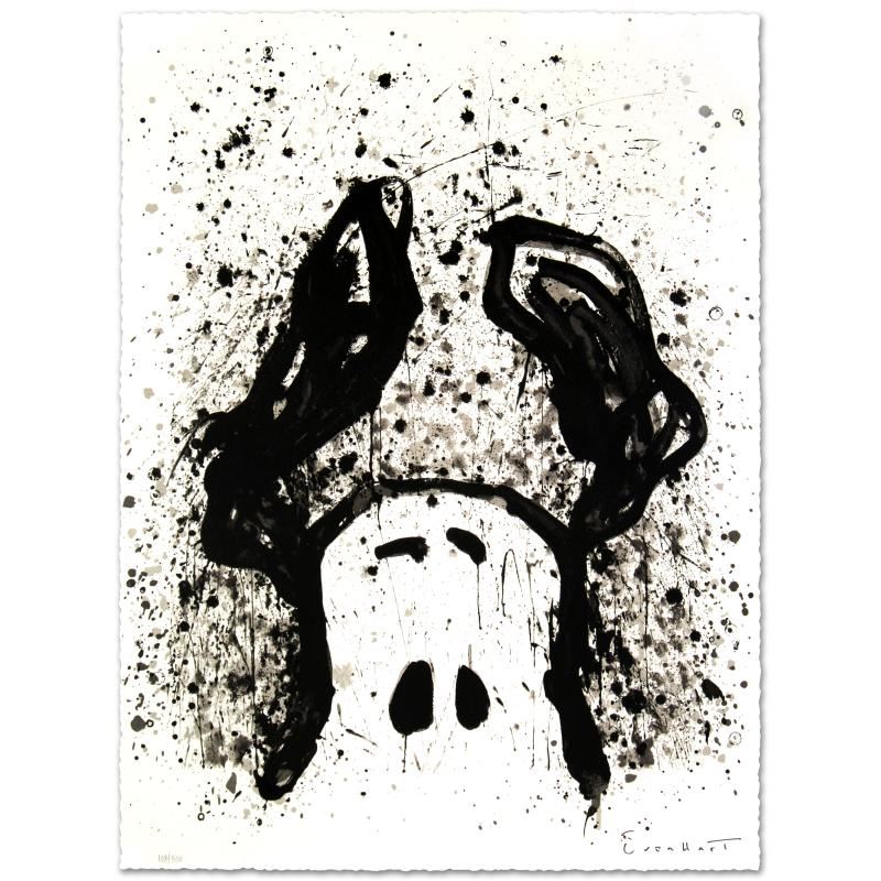 Master Artist Tom Everhart is the protege of famed "Peanuts" creator, Charles M. Schulz (1922â€"2000). As the only artist in the world granted the rights to draw the "Peanuts" characters in his own work, Everhart creates vibrant, extremely collectible rainbow masterpieces featuring Snoopy, Woodstock and the gang. "Watchdog 12 O'Clock" is a limited edition hand pulled original lithograph on museum quality deckle-edge paper, numbered and hand signed by Everhart! Includes certificate of authenticity! Measures approx. 22.5" x 30" (image only/no border). This artwork was created on one of two rare antique Marinoni Voirin lithograph presses that date back to the 1800's, and are reputed to come from the Paris print shop used by Henri Toulouse-Lautrec. There are only 7 of these magnificent beasts left in the world: the smaller one (with a print bed size of 25" x 35"), weighs 9 tons, and the larger one weighs in at 11 tons (print bed size 31" x 47"). The significance of this is that the lithographs produced by this method are of the finest quality, using techniques that are so labor and time intensive that very few master printers know how to operate and care for these presses today. Each lithograph is created with hand-mixed colors applied one at a time - a highly trained and synchronized team must hand feed each museum-quality sheet of paper through the press numerous times in order to set the colors and impressions, while the Chromist - a trained color specialist - adjusts each color by look and feel to match the original artwork, as if mixing a potion. The result is an image with maximum pigment saturation, formed through rich layers of color that imbue the artwork with a permanency of brilliance - proven over centuries to last. In contrast, today's printers use a method more akin to a dot matrix style application, with the colors all premixed and sprayed onto a sheet in a uniform layer, resulting in a much less saturated image that is susceptible to fading and imperfect color reproduction. This is one of the final Tom Everhart editions to be printed using this very special technique.