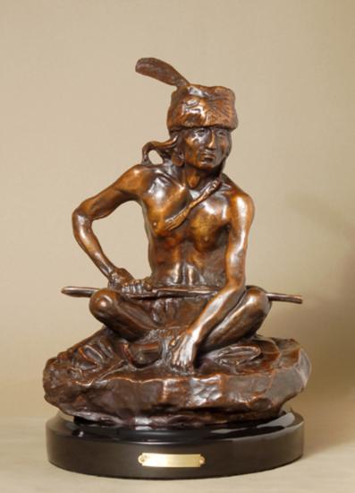 American, armed with both a modern rifle and a more traditional knife, keeping a close watch over the plains. This artwork has been cast of the finest pure bronze , and boasts a deep, rich patina finish giving it a look of authentic age.