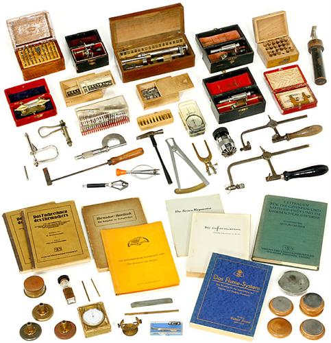 Watchmaker's Books and Tools 1) Specialists literature for clock- and watchmakers, 7 rare titles in German language (titles above). - And: 2) Large lot of special watchmaker's tools.<Br>