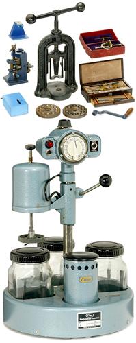 Watchmaker's Tools 1) Electrically driven cleaning machine "Elma", very good condition. - 2) Cast iron spindle press. - 3) Ring or wire press. - 4) Planteur. - 5) Special tools for finish treatment. - And: 6) Electronic timer.<Br>