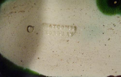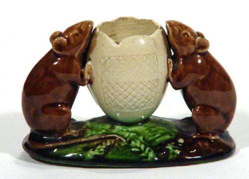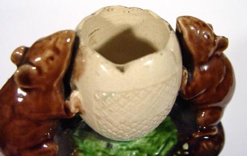 Watcombe pottery match striker, modelled as two mice flanking an egg shaped match holder on a leaf m
