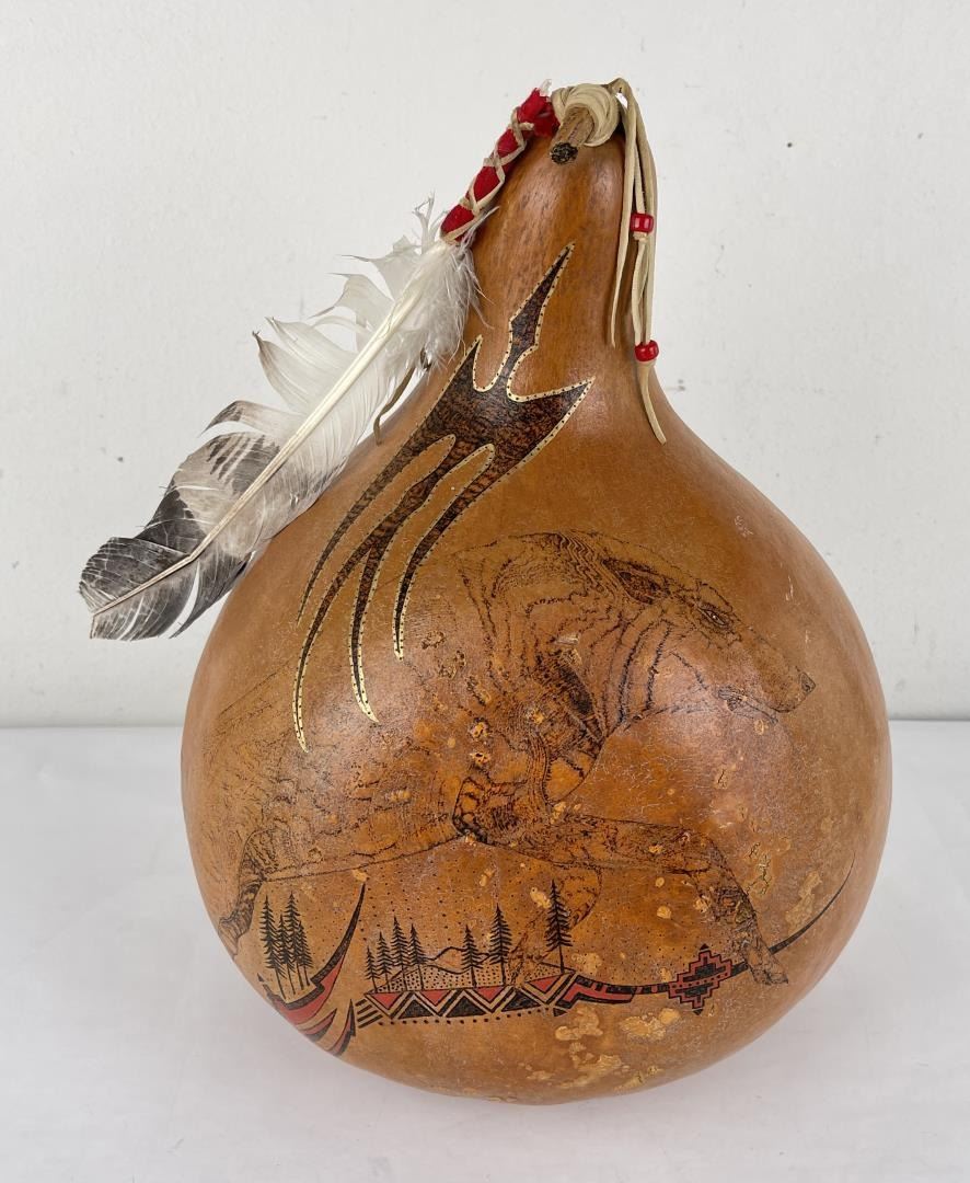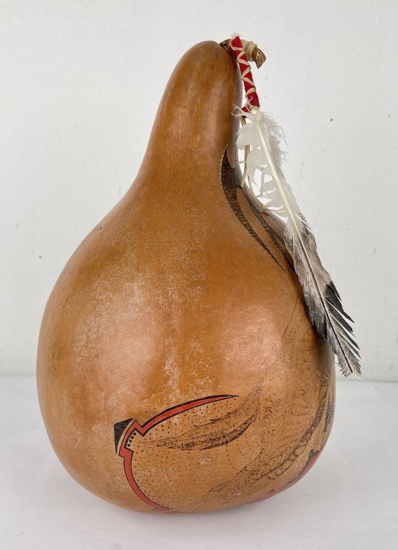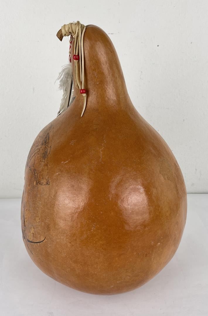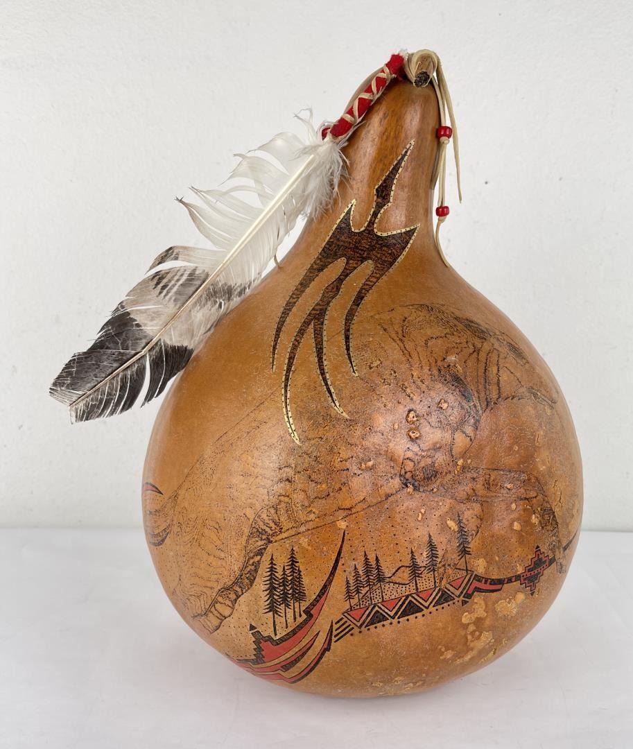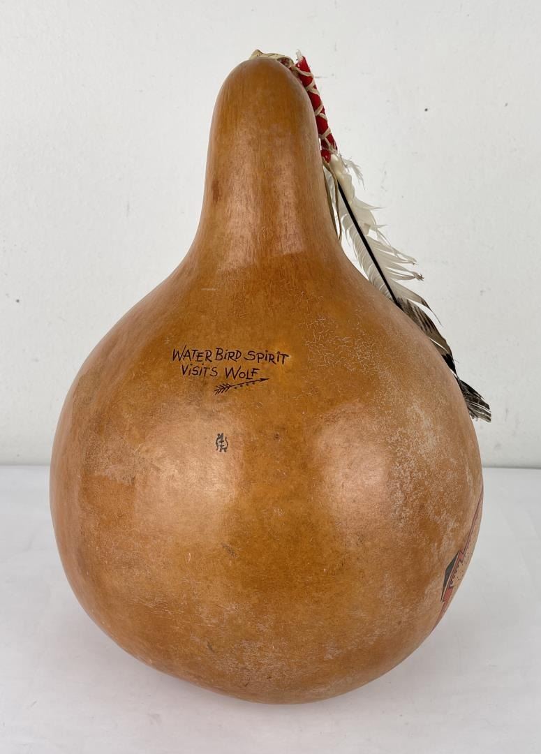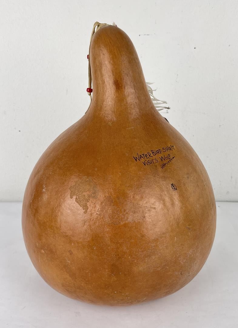 Very nice gourd. Crafted by Water Bird Spirit Visits Wolf. 17" tall.