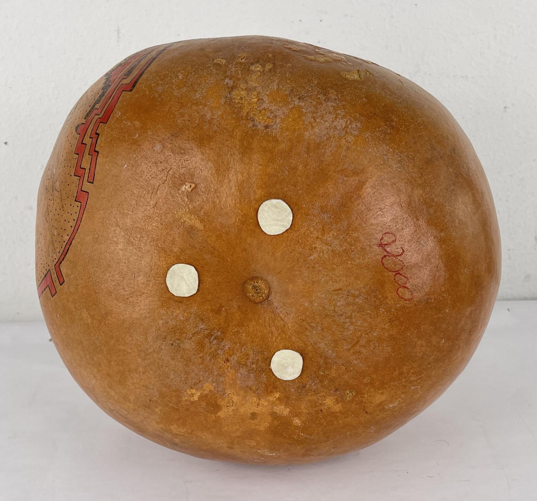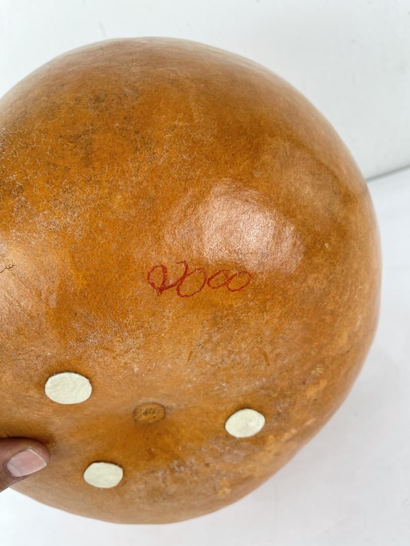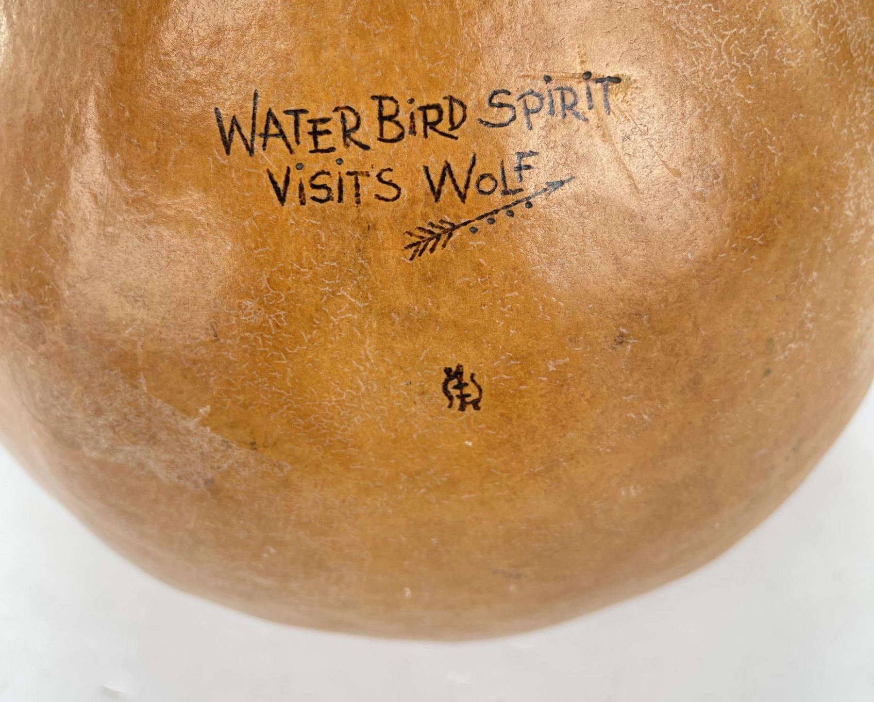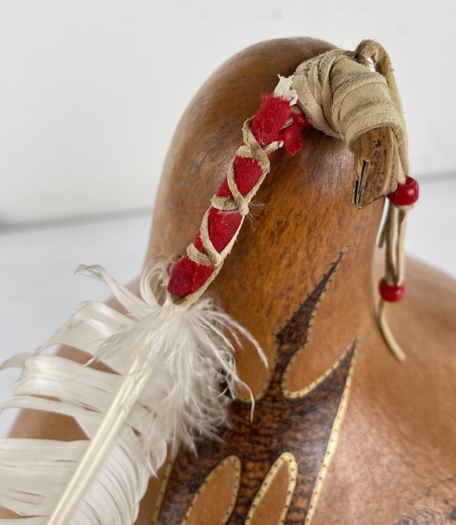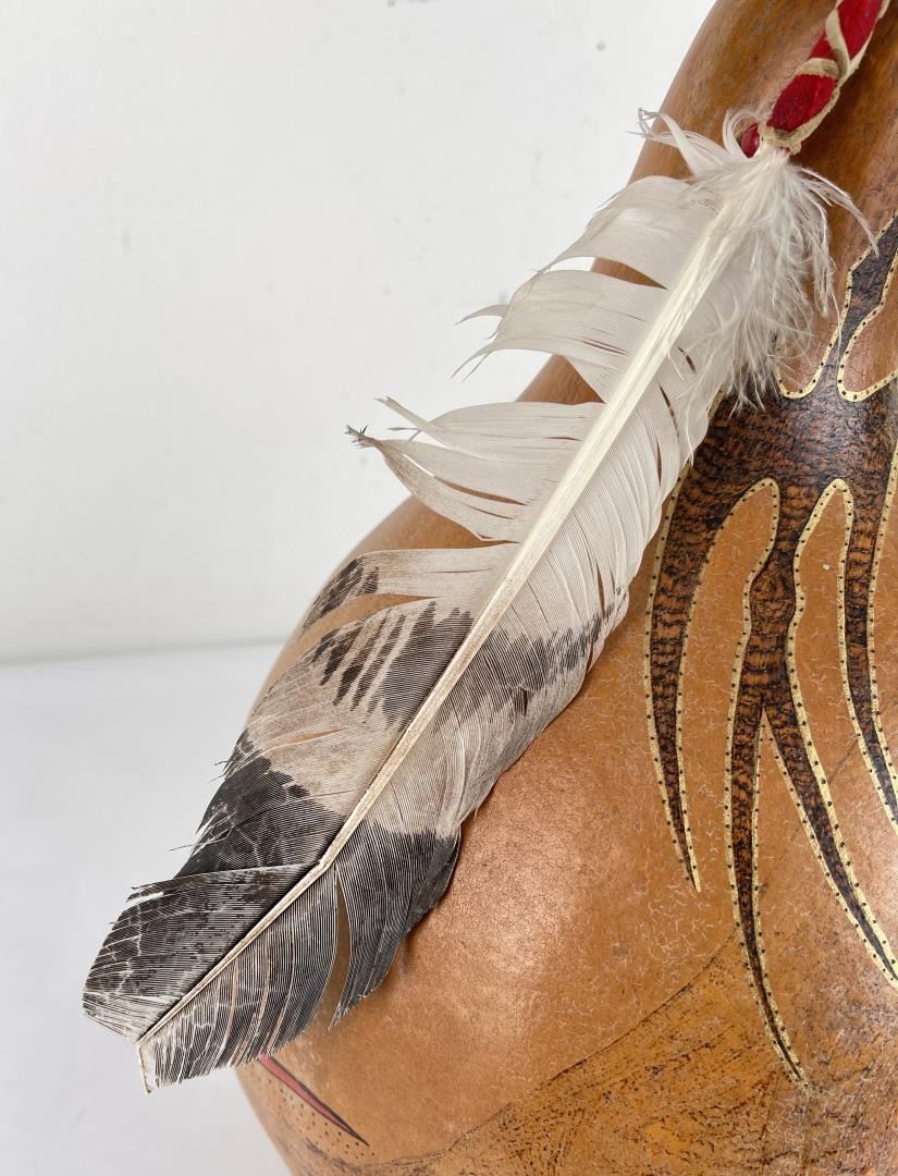 Very nice gourd. Crafted by Water Bird Spirit Visits Wolf. 17" tall.