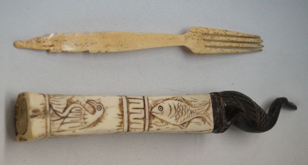 Water Buffalo Horn & Bone Herb Box and Fork. The box is intricately carved and topped by a Heron. It measures approx. 8.5''H x 1''W. The fork is 3 tined and also carved. It measures approx. 7.25'' long.