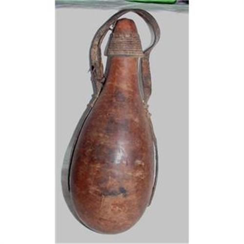Old and unusual water flask. Made out of a gourd with leather trim. 12" Tall. Have no idea of age or origin. The gourd has the appearance of leather, but it's very lightweight.