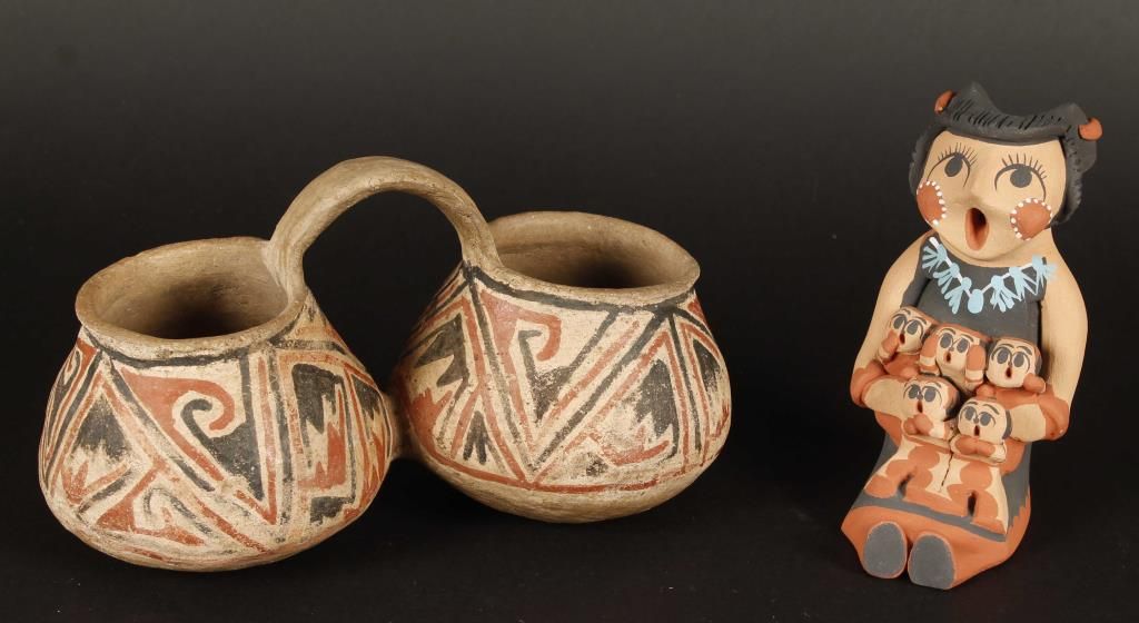(1) Double ladle with red and black geometric design. (1) Storyteller with 5 children, signed on base "C Sando".