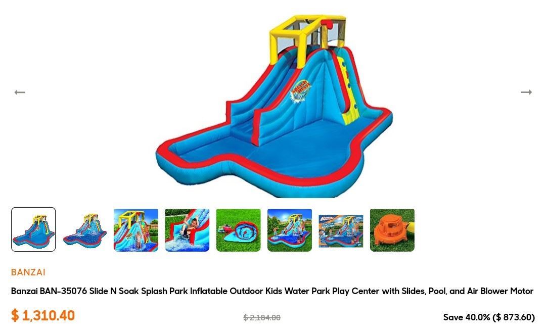 Inflatable outdoor play center with water slide, climbing wall, and large splash pool, includes air blower motor, new.