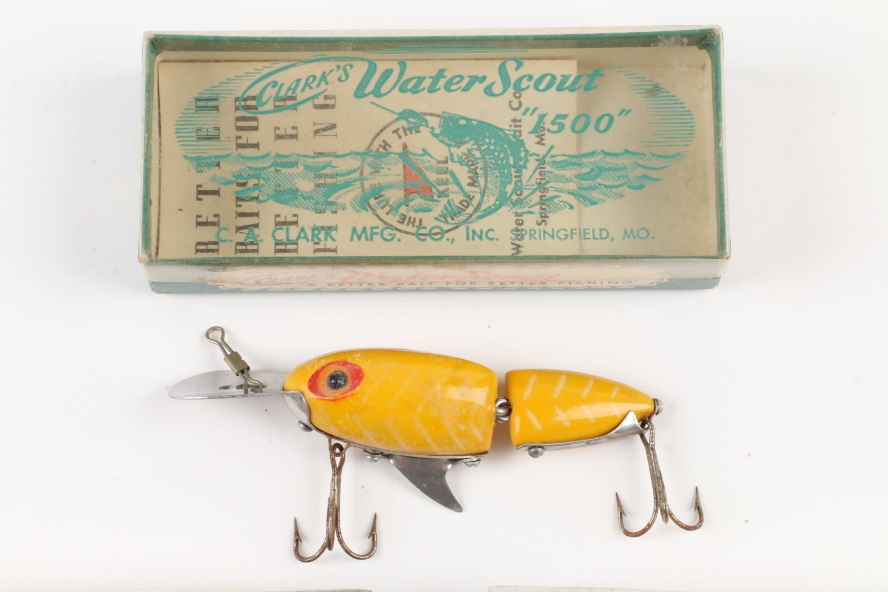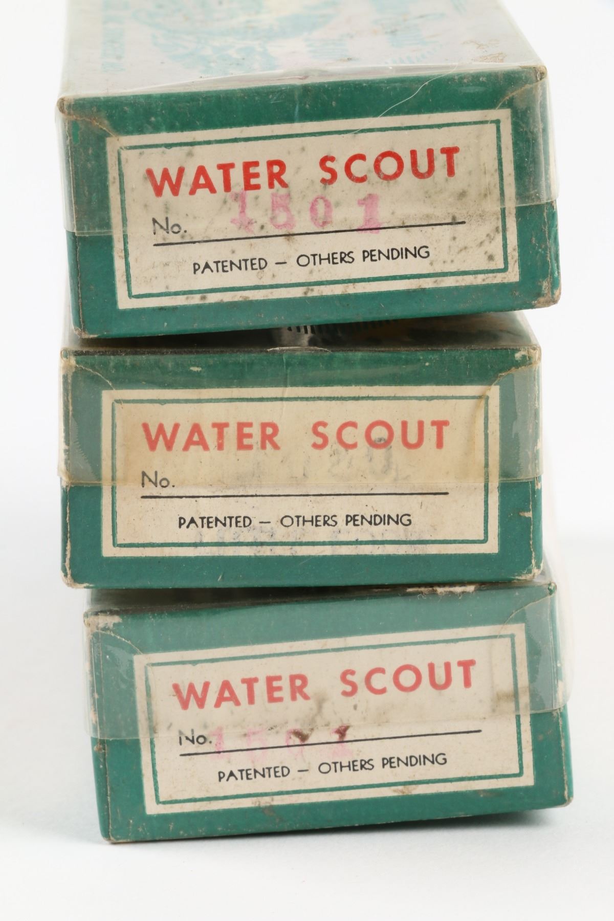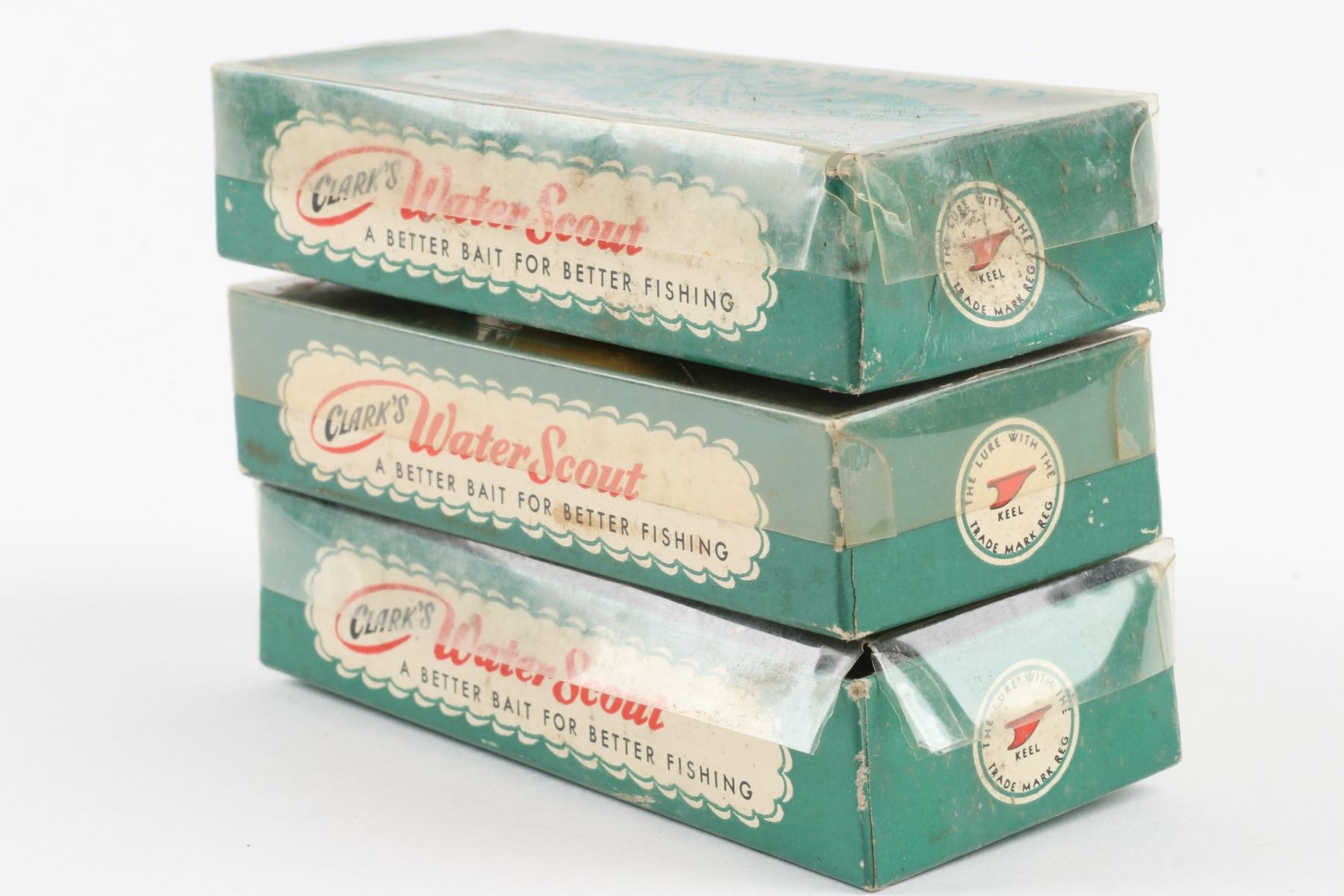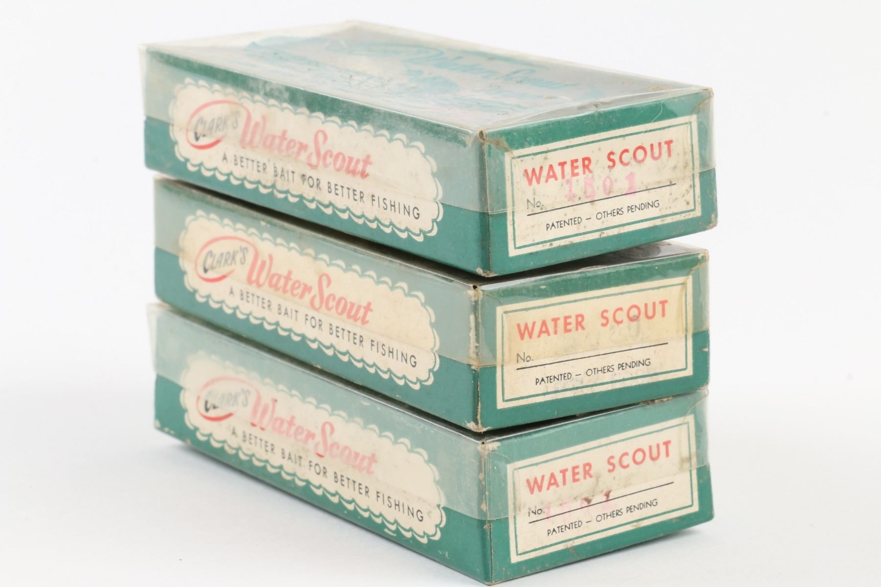 Water Scout Bait Co., United States. Boxed. Material: Mixed. Quantity: 3. Grade: VG+. 4.5" boxes Est. $100-125.