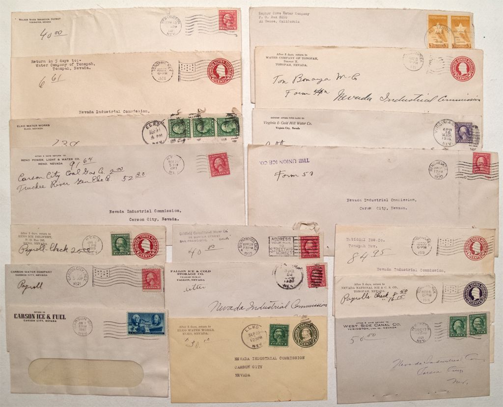 Lot of 18. includes Union Ice Company of Reno, Reno Power, Light, & Water, Reno Ice Delivery, Zephyr Cove Water, Walker River Irrigation of Yerington, West Side Canal of Yerington, Goldfield Consolidated Water, Water Company of Tonopah, National Ice Company of Tonopah, Nevada National Ice of Tonopah, Water Company of Tonopah, Fallon Ice & Cold Storage, Carson Water, Carson Ice & Fuel, Elko Water Works, Virginia & Gold Hill Water Co. (Two covers c1940's.)