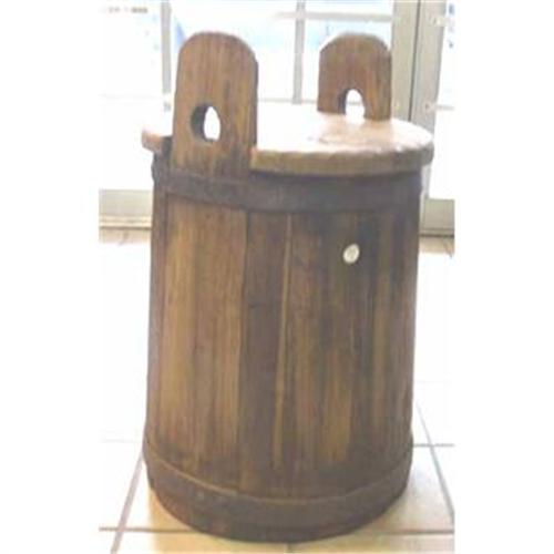 Wonderful water bucket banded with metal on top and bottom. Lid comes off and has carved date. Bottom diameter is 14.25"