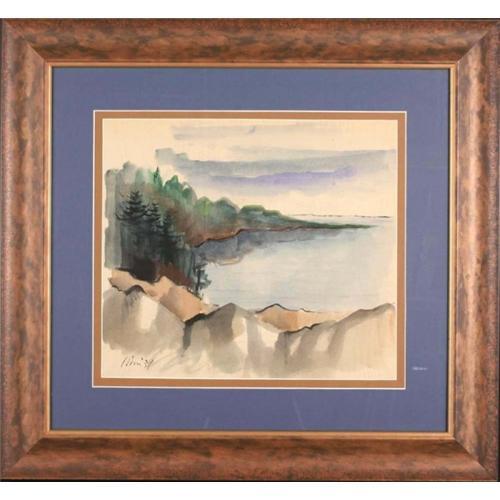 This beautifully framed watercolor of a shore view is dated 1939. Cohn?s spare, clean, expressive style is light and gestural. He uses a few sure strokes to convey a striking, fresh waterscape. This dramatic, 27? by 29? watercolor is uniquely framed in a splendid, copper colored carved wood frame. Harold Cohn?s ?Water?s Edge? is an excellent buy for those who love watercolors.