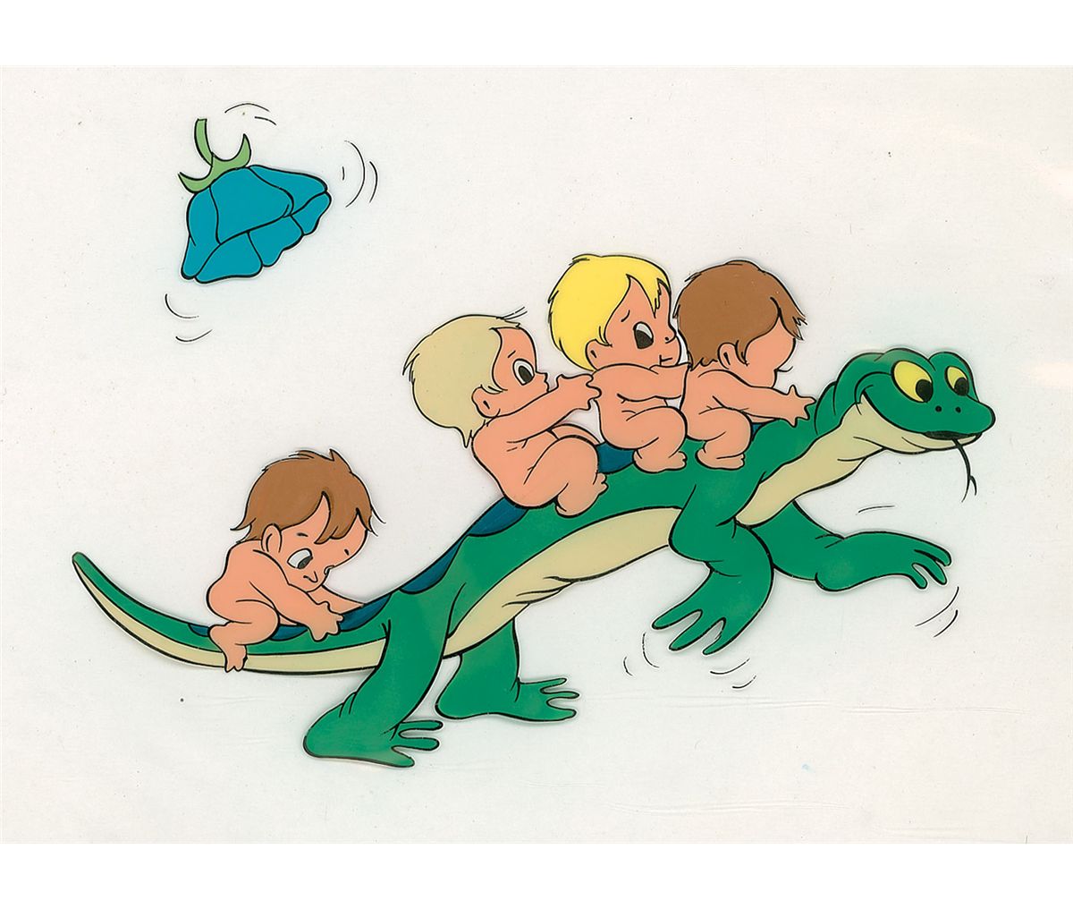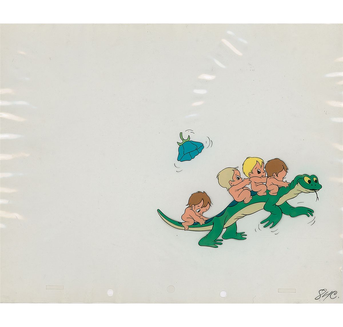 (Walt Disney Studios, 1935) Original production cel featuring Waterbabies with Lizard from Silly Symphony, showing the Waterbabies riding on the lizard’s back. Image measures 5.5 x 4, with overall dimensions of 12 x 9.75. Restored to fine condition, with slight rippling to edges. A rare full-sheet cel.